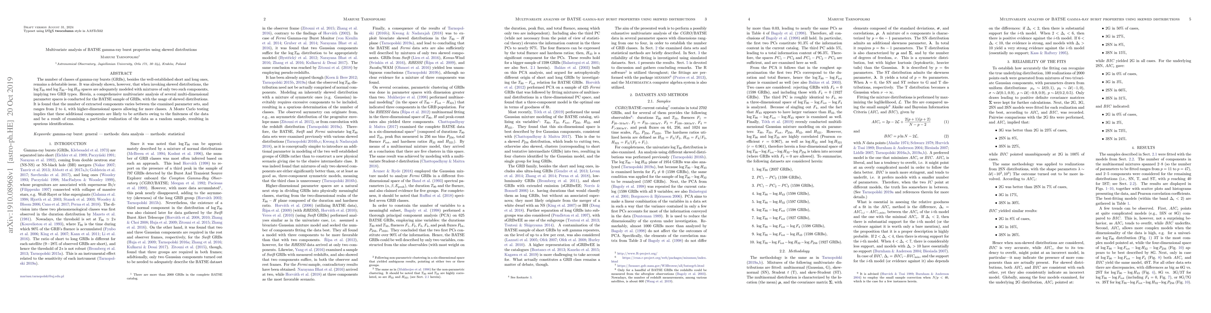 This paper conducts a multivariate analysis of BATSE gamma-ray burst (GRB) properties using skewed distributions, finding that two to four GRB types exist depending on the parameter space. Monte Carlo tests suggest that additional components may be artifacts due to finite data and random sampling.