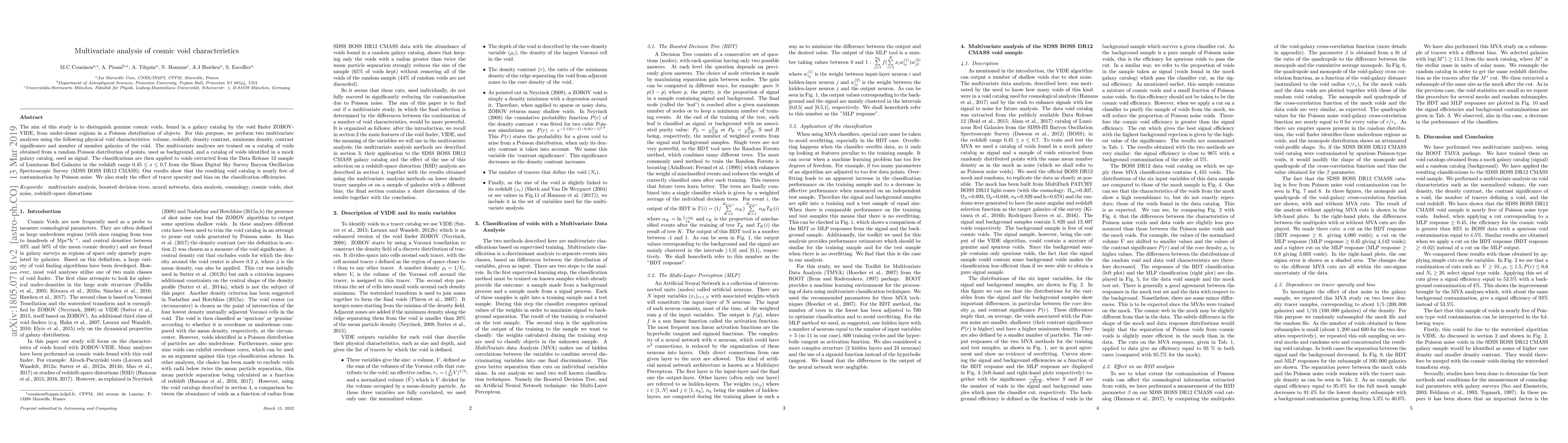 The aim of this study is to distinguish genuine cosmic voids, found in a galaxy catalog by the void finder ZOBOV-VIDE, from under-dense regions in a Poisson distribution of objects. For this purpose, we perform two multivariate analyses using the following physical void characteristics: volume, redshift, density contrast, minimum density, contrast significance and number of member galaxies of the void. The multivariate analyses are trained on a catalog of voids obtained from a random Poisson distribution of points, used as background, and a catalog of voids identified in a mock galaxy catalog, used as signal. The classifications are then applied to voids extracted from the Data Release 12 sample of Luminous Red Galaxies in the redshift range 0.45 $\leq$ z $\leq$ 0.7 from the Sloan Digital Sky Survey Baryon Oscillation Spectroscopic Survey (SDSS BOSS DR12 CMASS). Our results show that the resulting void catalog is nearly free of contamination by Poisson noise. We also study the effect of tracer sparsity and bias on the classification efficiencies.