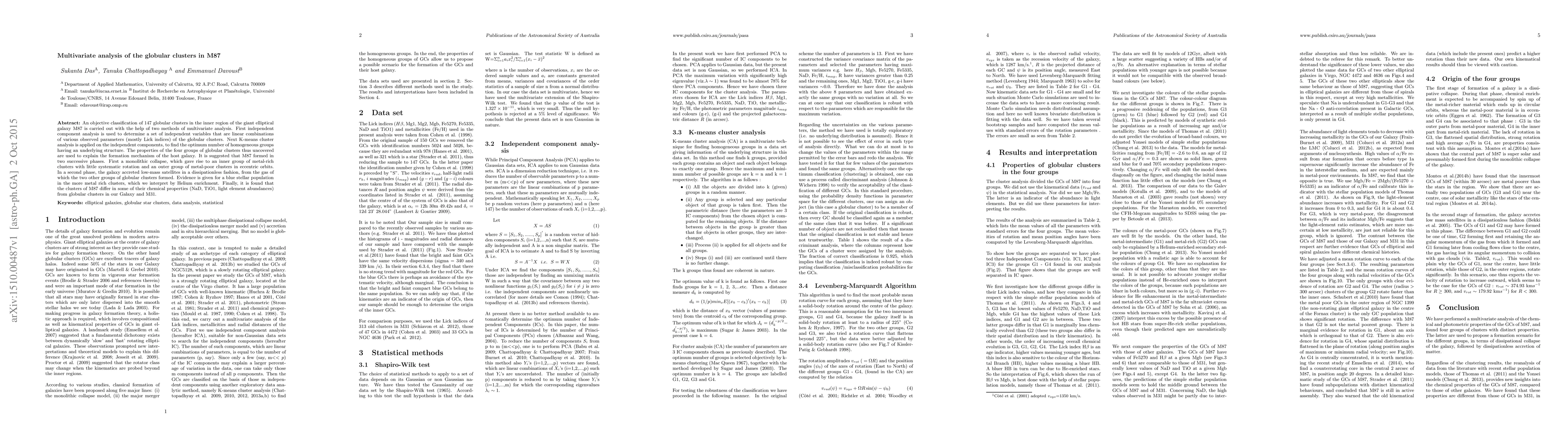 An objective classification of 147 globular clusters in the inner region of the giant elliptical galaxy M87 is carried out with the help of two methods of multivariate analysis. First independent component analysis is used to determine a set of independent variables that are linear combinations of various observed parameters (mostly Lick indices) of the globular clusters. Next K-means cluster analysis is applied on the independent components, to find the optimum number of homogeneous groups having an underlying structure. The properties of the four groups of globular clusters thus uncovered are used to explain the formation mechanism of the host galaxy. It is suggested that M87 formed in two successive phases. First a monolithic collapse, which gave rise to an inner group of metal-rich clusters with little systematic rotation and an outer group of metal-poor clusters in eccentric orbits. In a second phase, the galaxy accreted low-mass satellites in a dissipationless fashion, from the gas of which the two other groups of globular clusters formed. Evidence is given {\bf for a blue stellar population in the more metal rich clusters, which we interpret by Helium enrichment.} Finally, it is found that the clusters of M87 differ in some of their chemical properties (NaD, TiO1, light element abundances) from globular clusters in our Galaxy and M31.