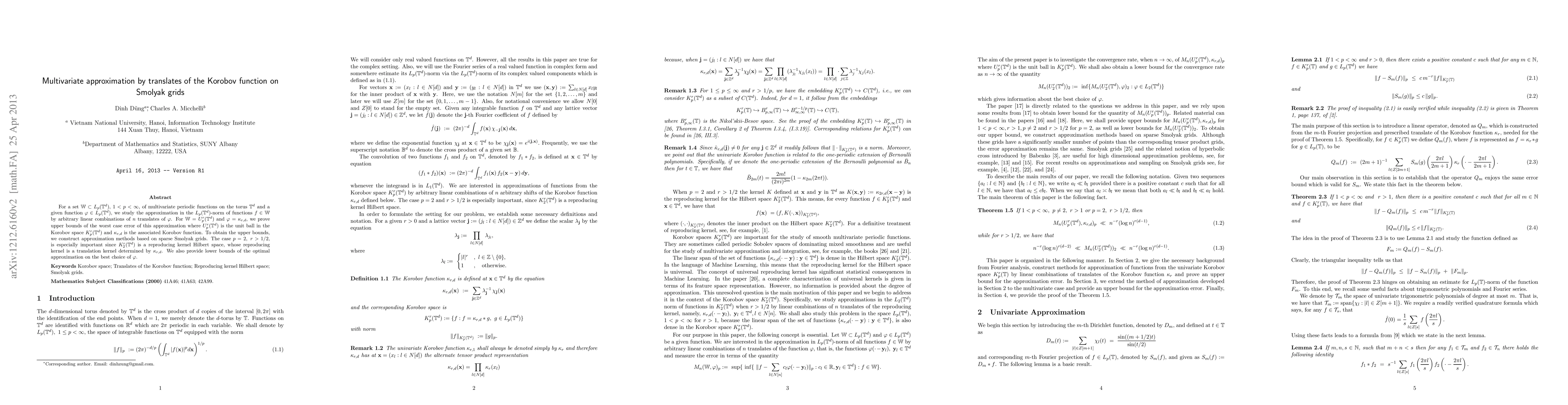 This paper investigates the approximation of multivariate periodic functions in $L_p(\bT^d)$ using linear combinations of translates of a specific Korobov function $\kappa_{r,d}$. It establishes upper bounds for the worst-case error in such approximations using sparse Smolyak grids, particularly focusing on the case where $p=2$ and $r > 1/2$. The study also provides lower bounds for the optimal approximation.