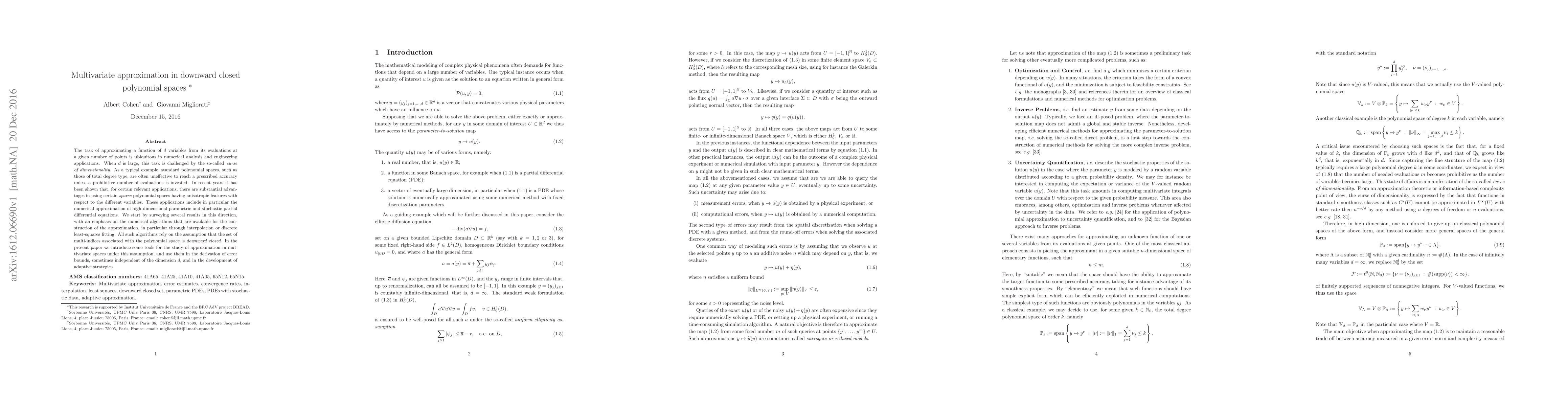 The task of approximating a function of d variables from its evaluations at a given number of points is ubiquitous in numerical analysis and engineering applications. When d is large, this task is challenged by the so-called curse of dimensionality. As a typical example, standard polynomial spaces, such as those of total degree type, are often uneffective to reach a prescribed accuracy unless a prohibitive number of evaluations is invested. In recent years it has been shown that, for certain relevant applications, there are substantial advantages in using certain sparse polynomial spaces having anisotropic features with respect to the different variables. These applications include in particular the numerical approximation of high-dimensional parametric and stochastic partial differential equations. We start by surveying several results in this direction, with an emphasis on the numerical algorithms that are available for the construction of the approximation, in particular through interpolation or discrete least-squares fitting. All such algorithms rely on the assumption that the set of multi-indices associated with the polynomial space is downward closed. In the present paper we introduce some tools for the study of approximation in multivariate spaces under this assumption, and use them in the derivation of error bounds, sometimes independent of the dimension d, and in the development of adaptive strategies.