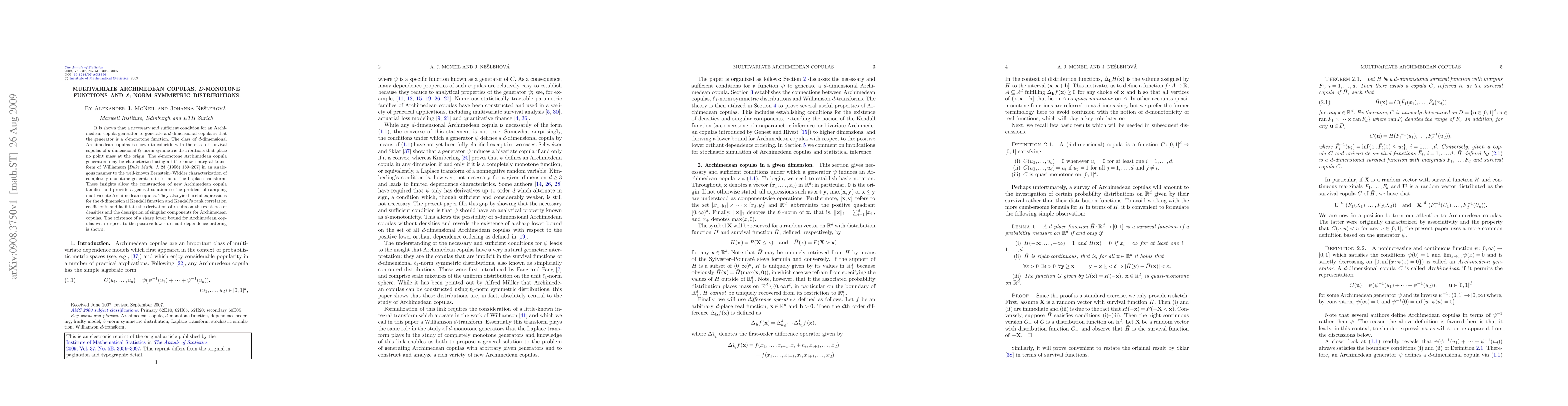 It is shown that a necessary and sufficient condition for an Archimedean copula generator to generate a $d$-dimensional copula is that the generator is a $d$-monotone function. The class of $d$-dimensional Archimedean copulas is shown to coincide with the class of survival copulas of $d$-dimensional $\ell_1$-norm symmetric distributions that place no point mass at the origin. The $d$-monotone Archimedean copula generators may be characterized using a little-known integral transform of Williamson [Duke Math. J. 23 (1956) 189--207] in an analogous manner to the well-known Bernstein--Widder characterization of completely monotone generators in terms of the Laplace transform. These insights allow the construction of new Archimedean copula families and provide a general solution to the problem of sampling multivariate Archimedean copulas. They also yield useful expressions for the $d$-dimensional Kendall function and Kendall's rank correlation coefficients and facilitate the derivation of results on the existence of densities and the description of singular components for Archimedean copulas. The existence of a sharp lower bound for Archimedean copulas with respect to the positive lower orthant dependence ordering is shown.