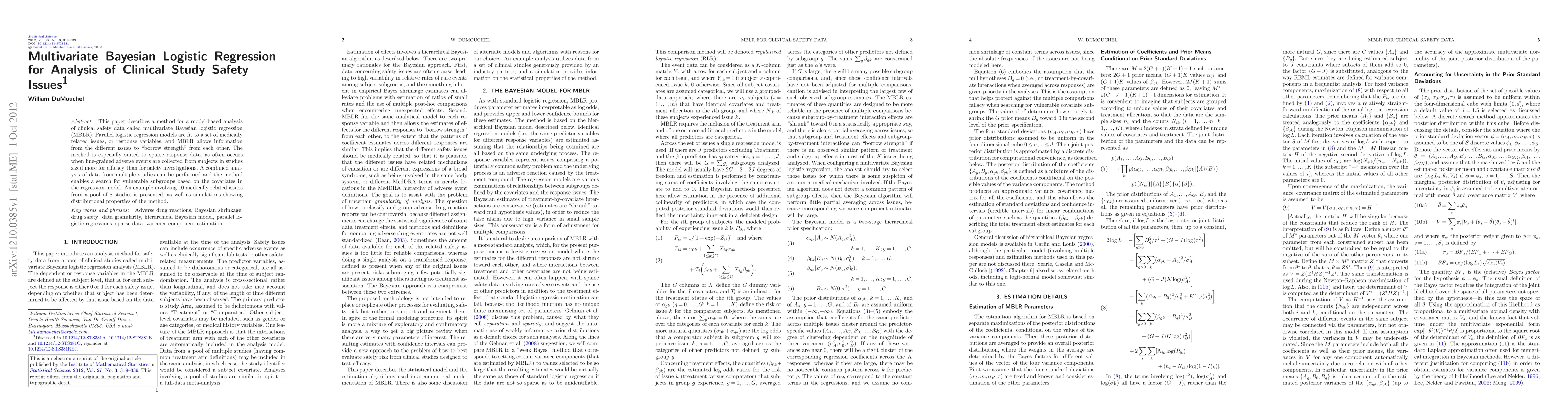 This paper introduces multivariate Bayesian logistic regression (MBLR) for analyzing clinical safety data, enabling the borrowing of strength across related adverse events and suitable for sparse data. The method supports combined study analyses and subgroup identification based on covariates.