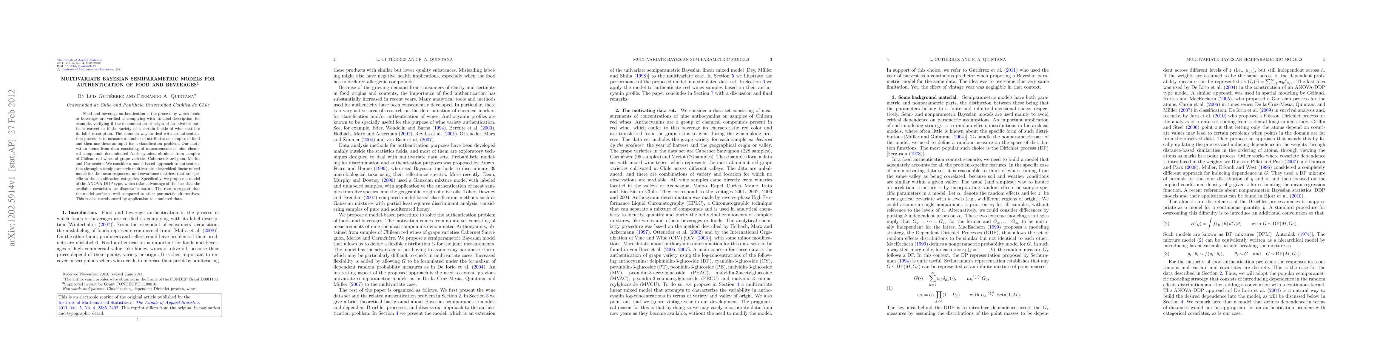 Food and beverage authentication is the process by which foods or beverages are verified as complying with its label description, for example, verifying if the denomination of origin of an olive oil bottle is correct or if the variety of a certain bottle of wine matches its label description. The common way to deal with an authentication process is to measure a number of attributes on samples of food and then use these as input for a classification problem. Our motivation stems from data consisting of measurements of nine chemical compounds denominated Anthocyanins, obtained from samples of Chilean red wines of grape varieties Cabernet Sauvignon, Merlot and Carm\'{e}n\`{e}re. We consider a model-based approach to authentication through a semiparametric multivariate hierarchical linear mixed model for the mean responses, and covariance matrices that are specific to the classification categories. Specifically, we propose a model of the ANOVA-DDP type, which takes advantage of the fact that the available covariates are discrete in nature. The results suggest that the model performs well compared to other parametric alternatives. This is also corroborated by application to simulated data.