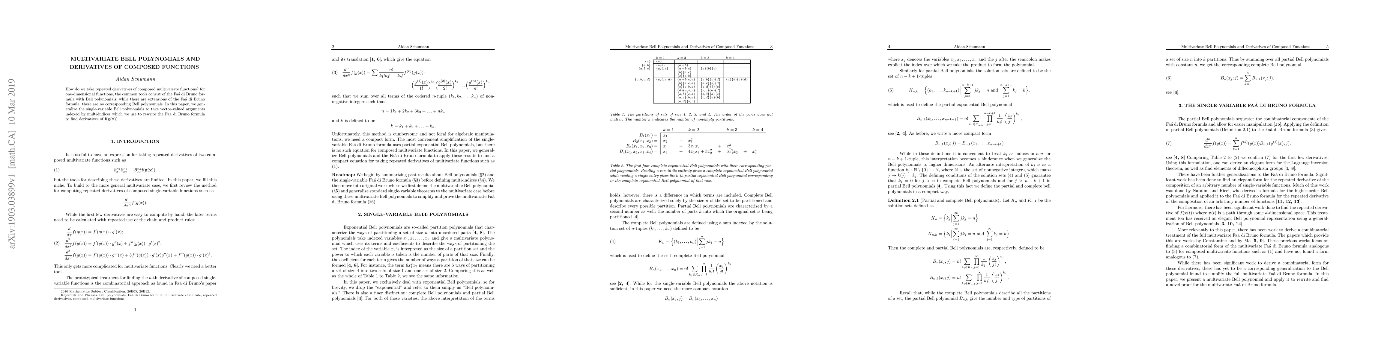 How do we take repeated derivatives of composed multivariate functions? for one-dimensional functions, the common tools consist of the Fa\'a di Bruno formula with Bell polynomials; while there are extensions of the Fa\'a di Bruno formula, there are no corresponding Bell polynomials. In this paper, we generalize the single-variable Bell polynomials to take vector-valued arguments indexed by multi-indices which we use to rewrite the Fa\'a di Bruno formula to find derivatives of $\textbf{f}(\textbf{g}(\textbf{x}))$.