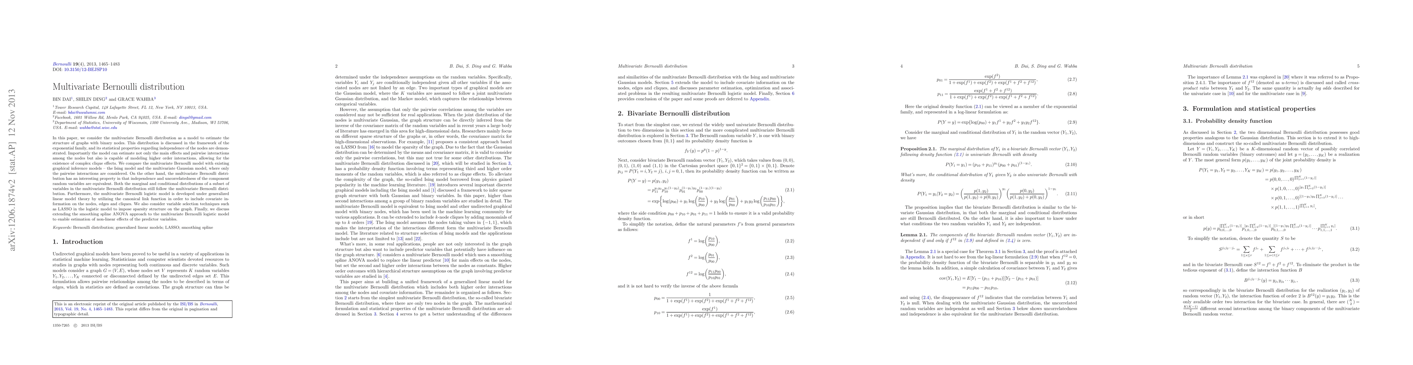 This paper explores the multivariate Bernoulli distribution as a model for estimating graph structures with binary nodes, emphasizing its capability to capture higher-order interactions beyond pairwise effects. It compares this model to the Ising and multivariate Gaussian models, highlighting its equivalence of independence and uncorrelatedness and its application within generalized linear models for incorporating covariate information.