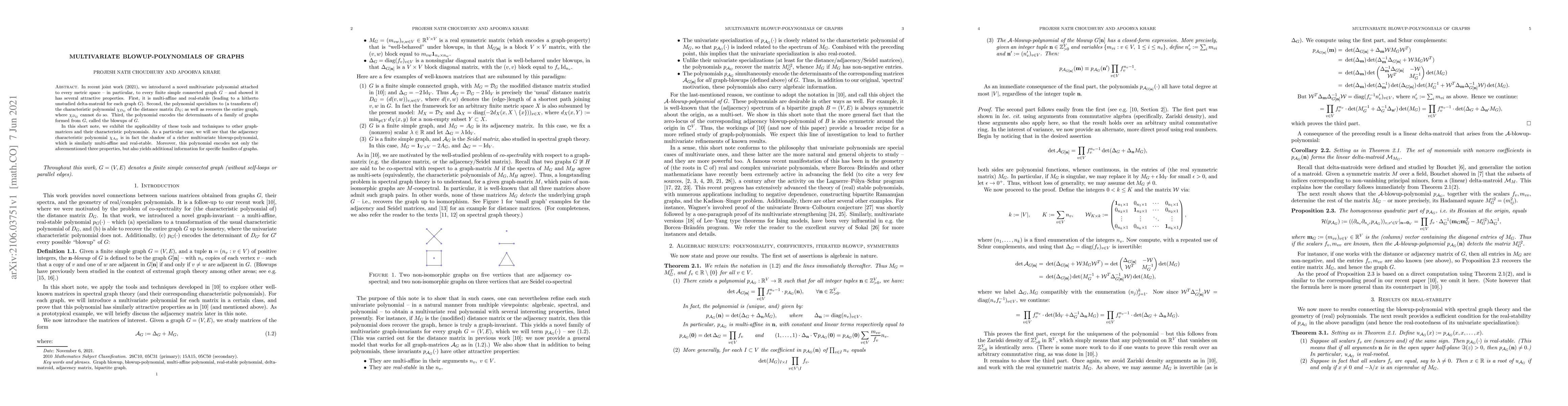 In recent joint work (2021), we introduced a novel multivariate polynomial attached to every metric space - in particular, to every finite simple connected graph $G$ - and showed it has several attractive properties. First, it is multi-affine and real-stable (leading to a hitherto unstudied delta-matroid for each graph $G$). Second, the polynomial specializes to (a transform of) the characteristic polynomial $\chi_{D_G}$ of the distance matrix $D_G$; as well as recovers the entire graph, where $\chi_{D_G}$ cannot do so. Third, the polynomial encodes the determinants of a family of graphs formed from $G$, called the blowups of $G$. In this short note, we exhibit the applicability of these tools and techniques to other graph-matrices and their characteristic polynomials. As a particular case, we will see that the adjacency characteristic polynomial $\chi_{A_G}$ is in fact the shadow of a richer multivariate blowup-polynomial, which is similarly multi-affine and real-stable. Moreover, this polynomial encodes not only the aforementioned three properties, but also yields additional information for specific families of graphs.