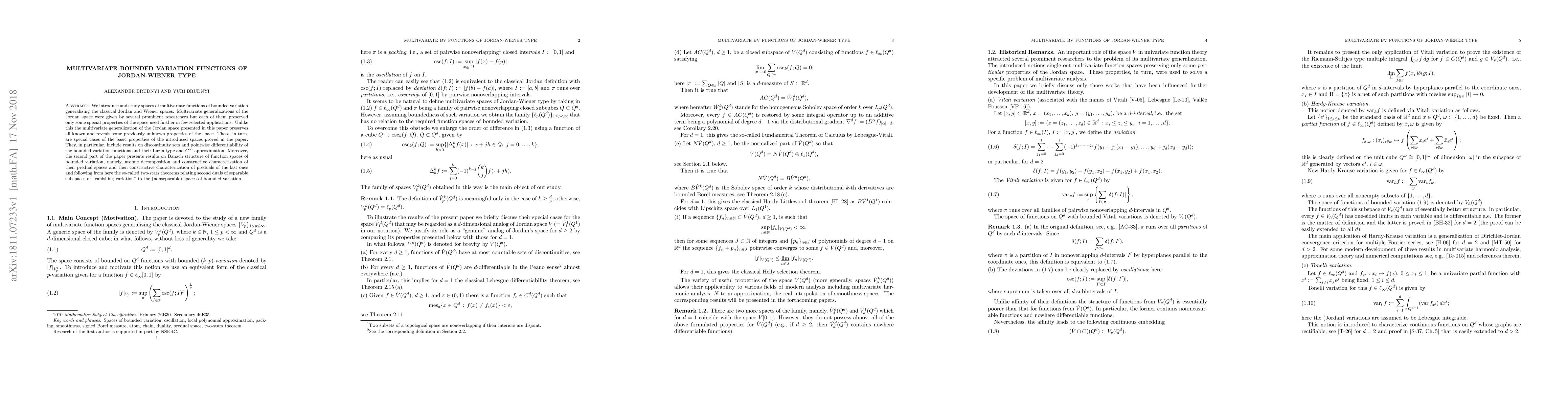 We introduce and study spaces of multivariate functions of bounded variation generalizing the classical Jordan and Wiener spaces. Multivariate generalizations of the Jordan space were given by several prominent researchers but each of them preserved only some special properties of the space used further in few selected applications. Unlike this the multivariate generalization of the Jordan space presented in this paper preserves all known and reveals some previously unknown properties of the space. These, in turn, are special cases of the basic properties of the introduced spaces proved in the paper. They, in particular, include results on discontinuity sets and pointwise differentiability of the bounded variation functions and their Luzin type and $C^\infty$ approximation. Moreover, the second part of the paper presents results on Banach structure of function spaces of bounded variation, namely, atomic decomposition and constructive characterization of their predual spaces and then constructive characterization of preduals of the last ones and following from here the so-called two-stars theorems relating second duals of separable subspaces of "vanishing variation" to the (nonseparable) spaces of bounded variation.