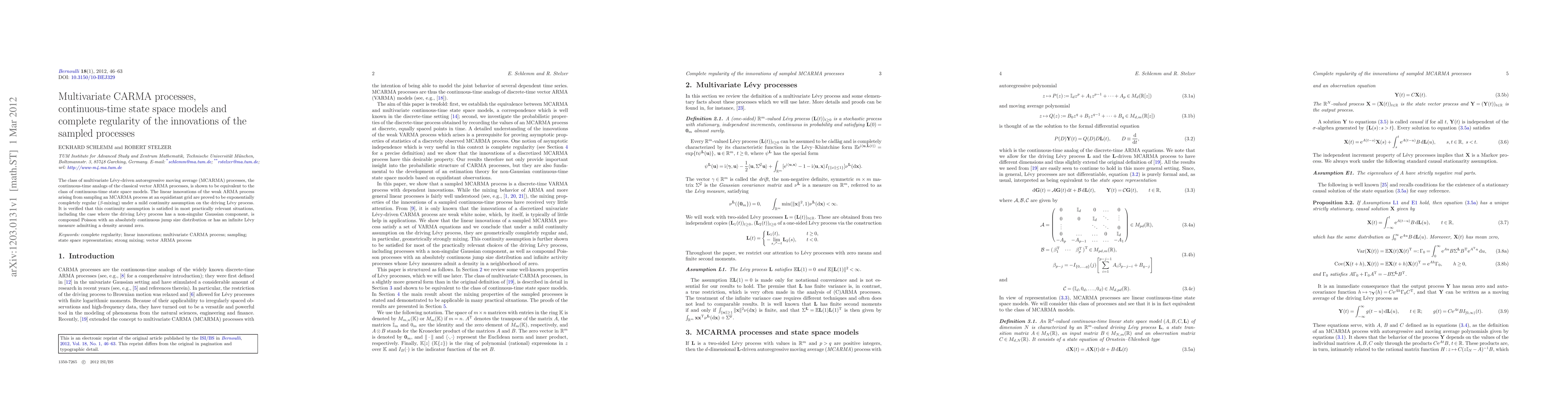 The class of multivariate L\'{e}vy-driven autoregressive moving average (MCARMA) processes, the continuous-time analogs of the classical vector ARMA processes, is shown to be equivalent to the class of continuous-time state space models. The linear innovations of the weak ARMA process arising from sampling an MCARMA process at an equidistant grid are proved to be exponentially completely regular ($\beta$-mixing) under a mild continuity assumption on the driving L\'{e}vy process. It is verified that this continuity assumption is satisfied in most practically relevant situations, including the case where the driving L\'{e}vy process has a non-singular Gaussian component, is compound Poisson with an absolutely continuous jump size distribution or has an infinite L\'{e}vy measure admitting a density around zero.