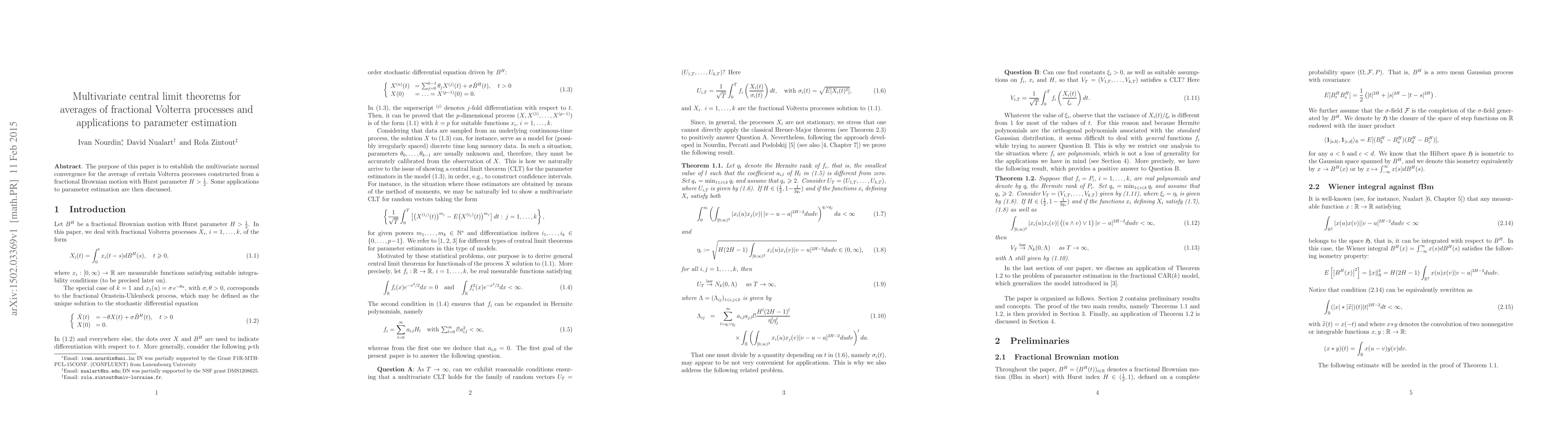 Researchers establish multivariate normal convergence for averages of Volterra processes from fractional Brownian motion with Hurst parameter H>1/2, with applications to parameter estimation.