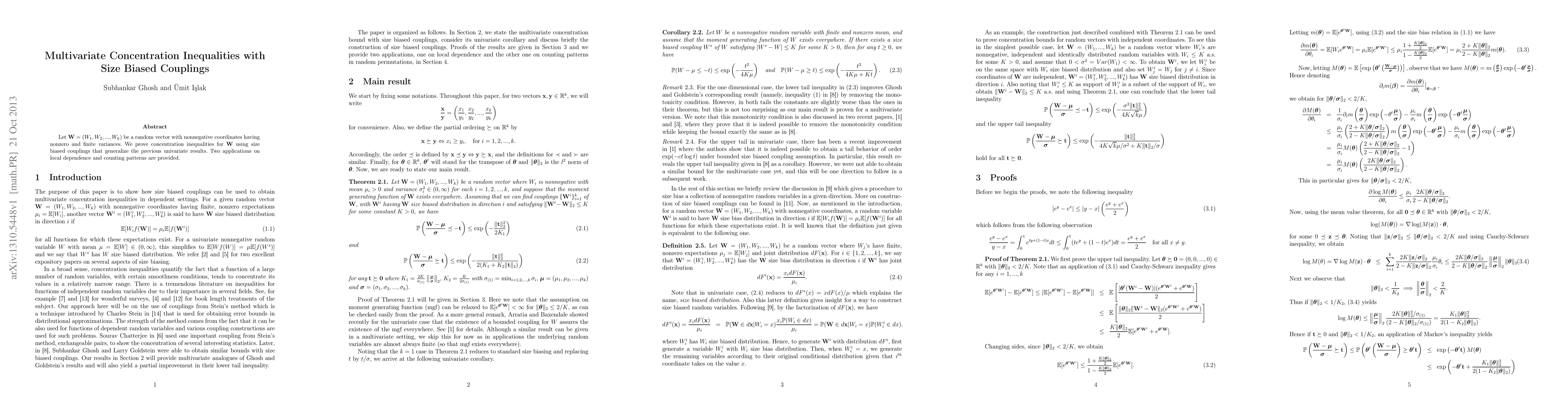 This paper proves concentration inequalities for multivariate random vectors using size biased couplings, extending previous univariate results. It also demonstrates applications in local dependence and counting patterns.
