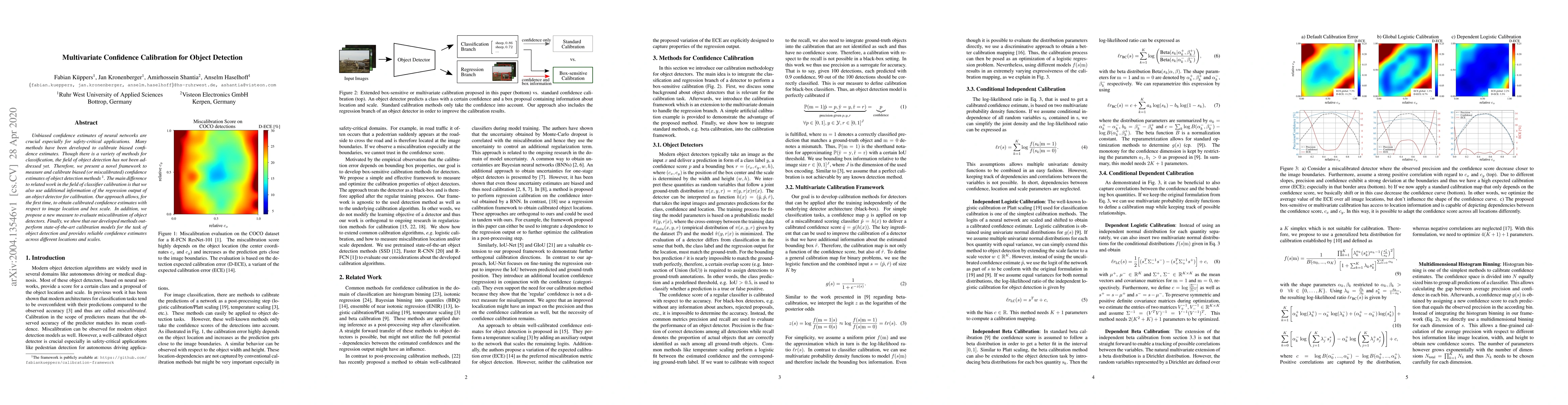 This paper introduces a novel framework for calibrating biased confidence estimates in object detection methods, utilizing both classification and regression outputs. The method provides calibrated confidence estimates that account for image location and box scale, outperforming existing calibration models.