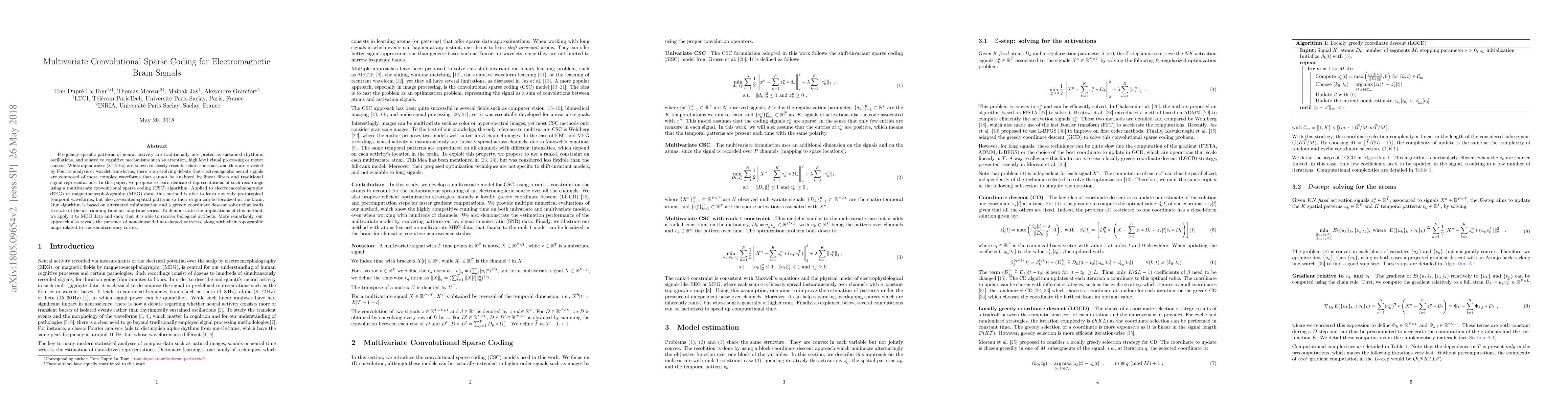 Frequency-specific patterns of neural activity are traditionally interpreted as sustained rhythmic oscillations, and related to cognitive mechanisms such as attention, high level visual processing or motor control. While alpha waves (8-12 Hz) are known to closely resemble short sinusoids, and thus are revealed by Fourier analysis or wavelet transforms, there is an evolving debate that electromagnetic neural signals are composed of more complex waveforms that cannot be analyzed by linear filters and traditional signal representations. In this paper, we propose to learn dedicated representations of such recordings using a multivariate convolutional sparse coding (CSC) algorithm. Applied to electroencephalography (EEG) or magnetoencephalography (MEG) data, this method is able to learn not only prototypical temporal waveforms, but also associated spatial patterns so their origin can be localized in the brain. Our algorithm is based on alternated minimization and a greedy coordinate descent solver that leads to state-of-the-art running time on long time series. To demonstrate the implications of this method, we apply it to MEG data and show that it is able to recover biological artifacts. More remarkably, our approach also reveals the presence of non-sinusoidal mu-shaped patterns, along with their topographic maps related to the somatosensory cortex.