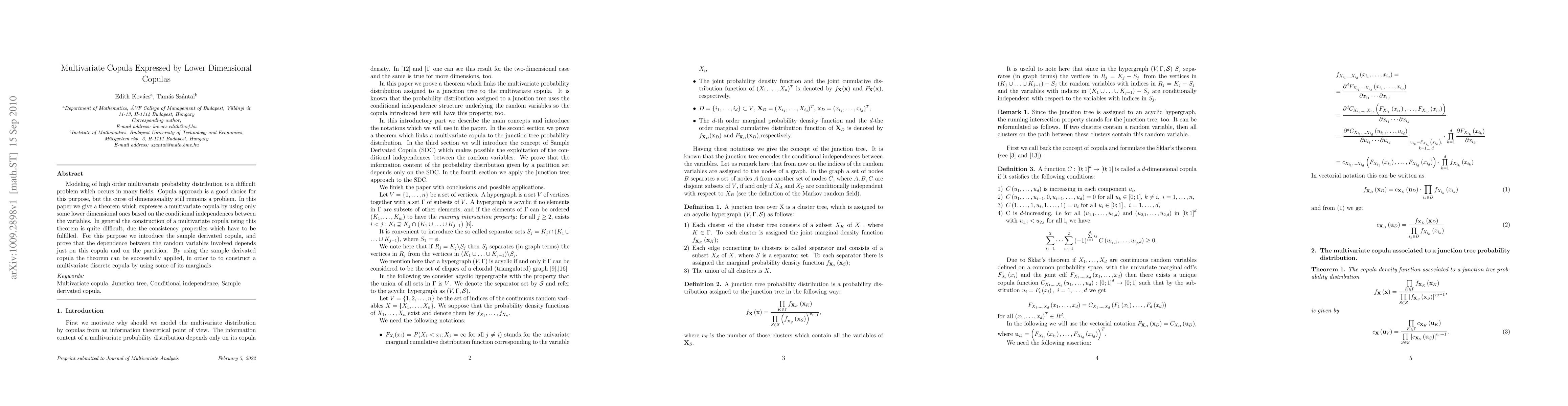 The paper presents a theorem expressing a multivariate copula using lower-dimensional copulas based on conditional independence between variables. It introduces the sample derived copula to facilitate the construction of a multivariate discrete copula from its marginals.