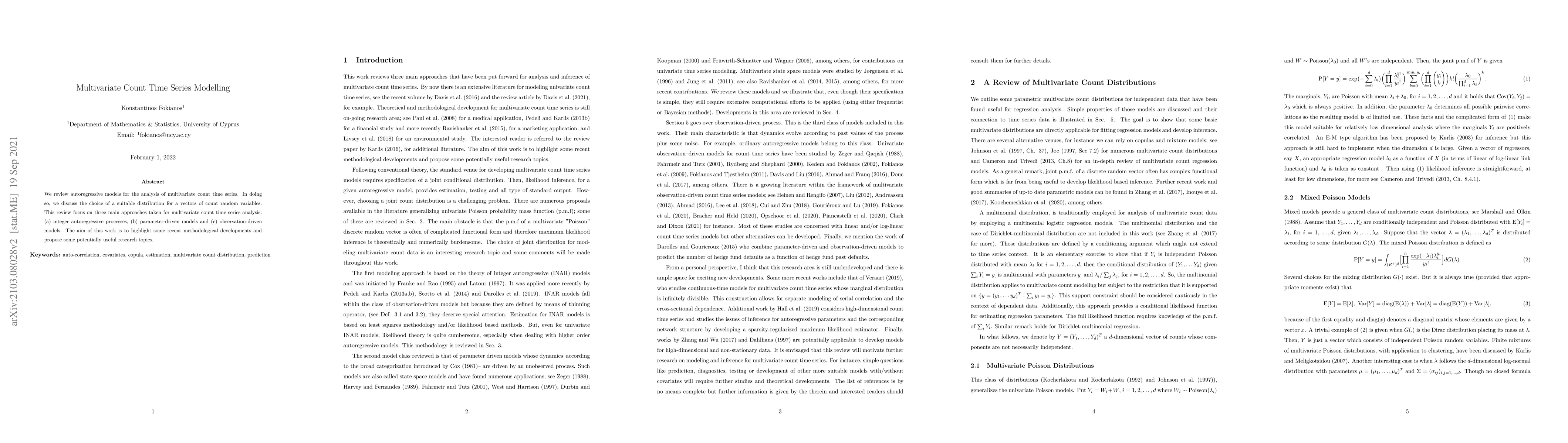 This paper reviews autoregressive models for multivariate count time series, focusing on integer autoregressive processes, parameter-driven models, and observation-driven models, to highlight recent methodological advancements and suggest new research directions.
