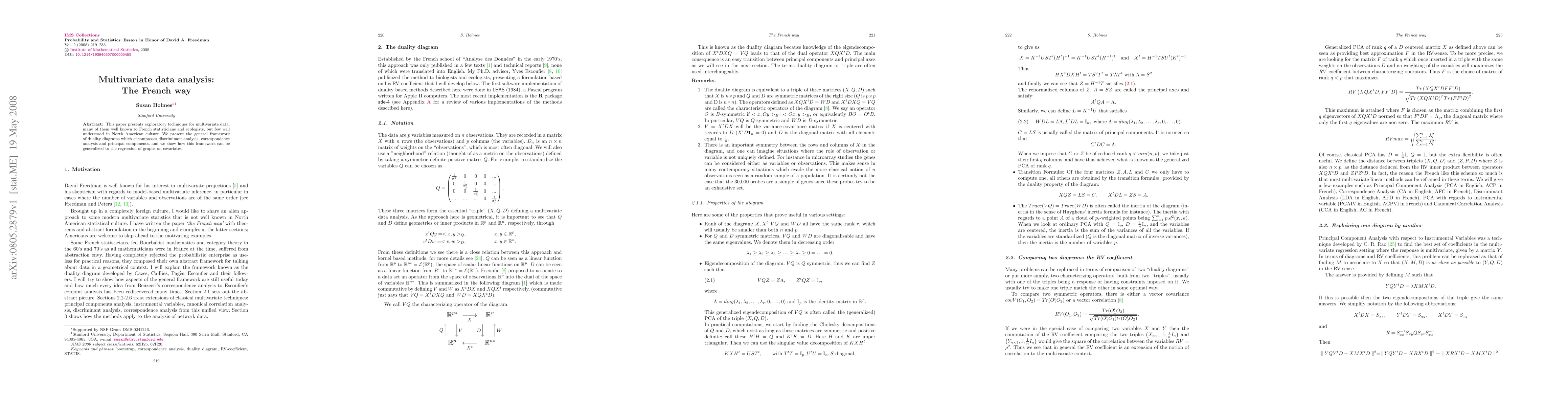 Researchers present a framework for multivariate data analysis using duality diagrams, which combines techniques like discriminant analysis, correspondence analysis, and principal components, highlighting the French approach to statistical methods.