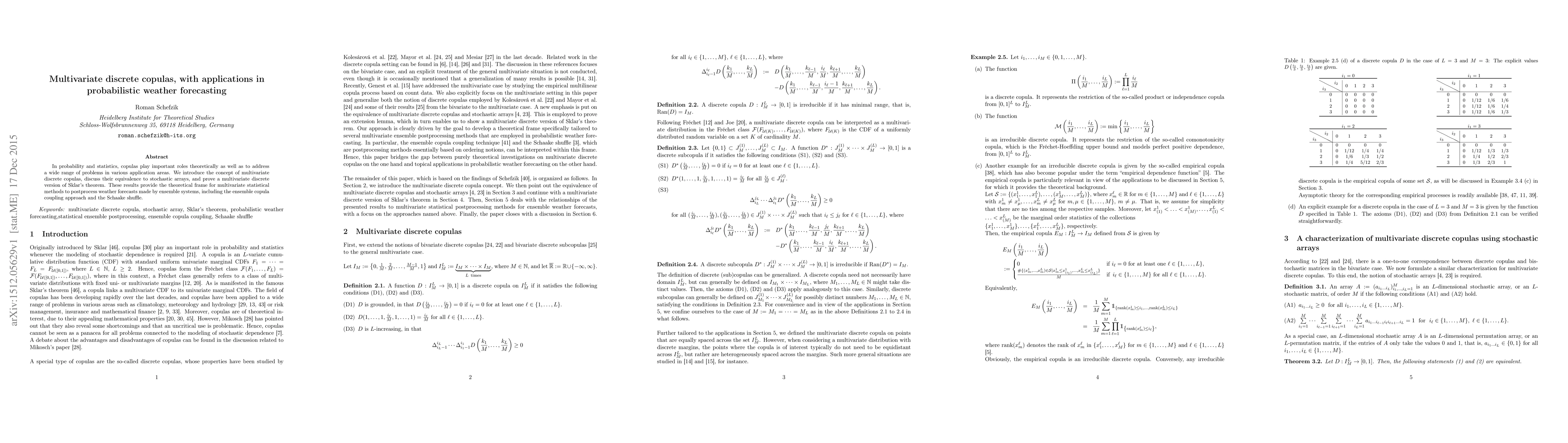 This paper introduces multivariate discrete copulas, establishing their equivalence to stochastic arrays and proving a multivariate version of Sklar's theorem. These theoretical advancements are applied to improve probabilistic weather forecasting through ensemble systems.
