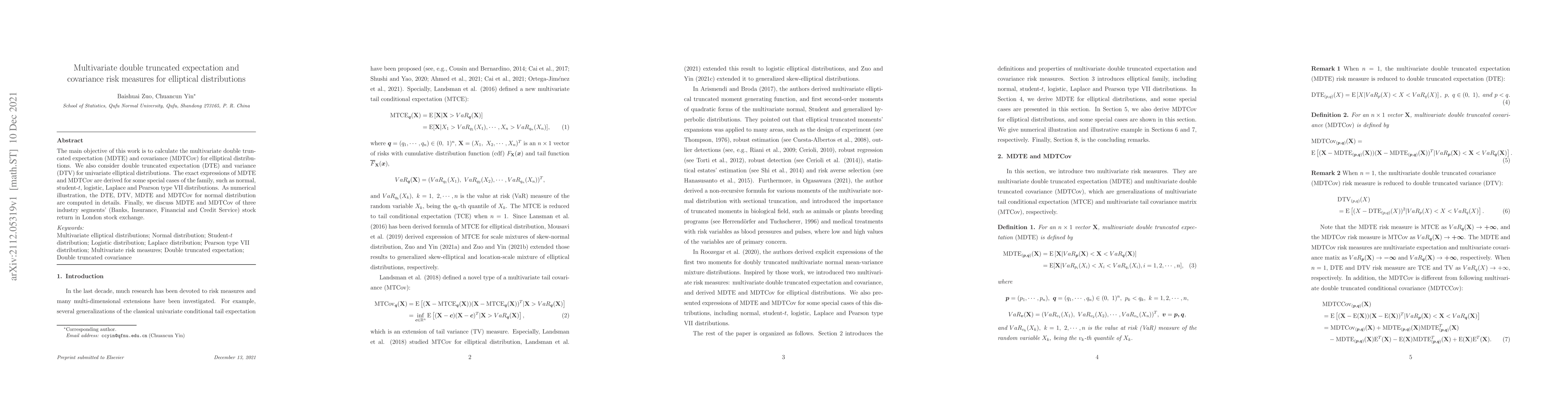 This paper derives exact expressions for multivariate double truncated expectation and covariance for elliptical distributions, focusing on special cases like normal, student-$t$, logistic, Laplace, and Pearson type VII distributions. It also computes these measures for the normal distribution and applies them to stock returns of three industry segments in the London stock exchange.