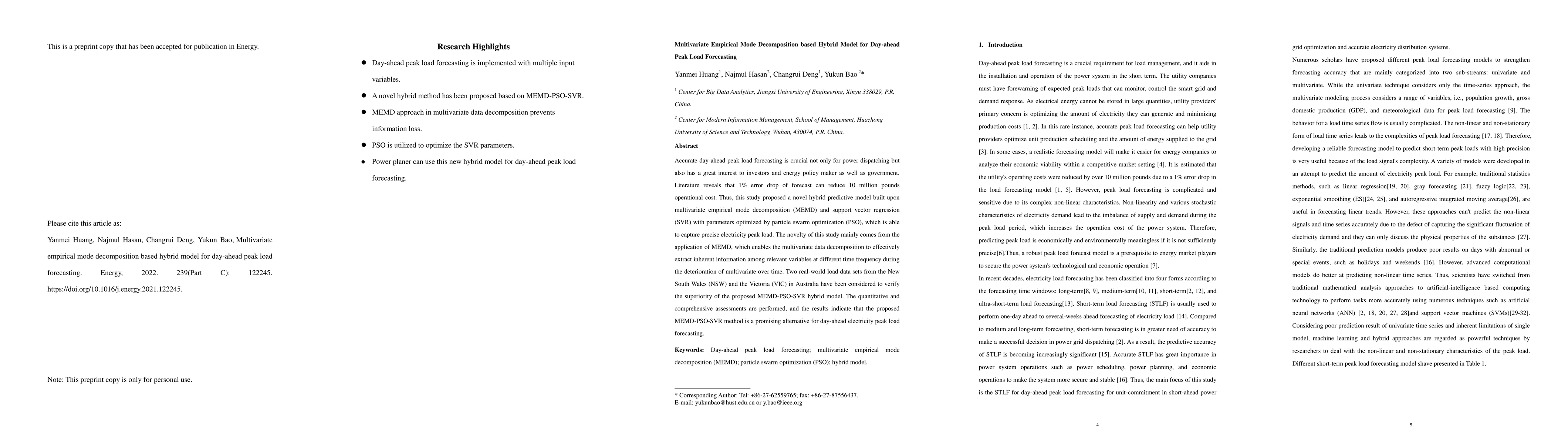 Accurate day-ahead peak load forecasting is crucial not only for power dispatching but also has a great interest to investors and energy policy maker as well as government. Literature reveals that 1% error drop of forecast can reduce 10 million pounds operational cost. Thus, this study proposed a novel hybrid predictive model built upon multivariate empirical mode decomposition (MEMD) and support vector regression (SVR) with parameters optimized by particle swarm optimization (PSO), which is able to capture precise electricity peak load. The novelty of this study mainly comes from the application of MEMD, which enables the multivariate data decomposition to effectively extract inherent information among relevant variables at different time frequency during the deterioration of multivariate over time. Two real-world load data sets from the New South Wales (NSW) and the Victoria (VIC) in Australia have been considered to verify the superiority of the proposed MEMD-PSO-SVR hybrid model. The quantitative and comprehensive assessments are performed, and the results indicate that the proposed MEMD-PSO-SVR method is a promising alternative for day-ahead electricity peak load forecasting.