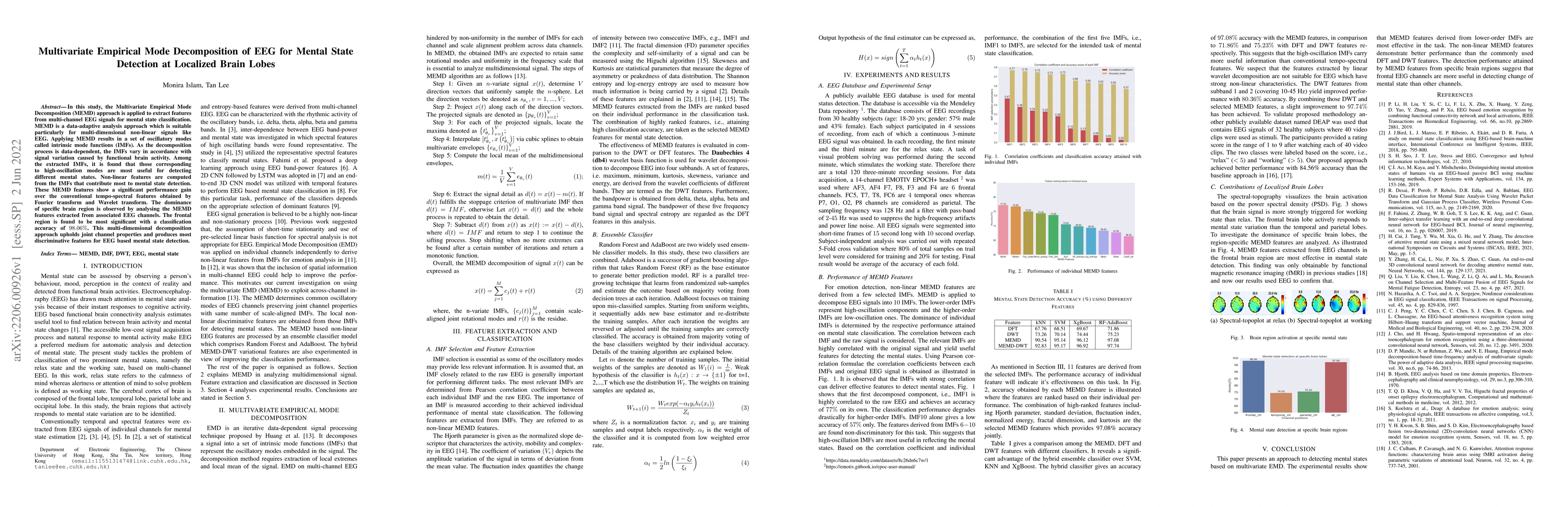 This study applies Multivariate Empirical Mode Decomposition (MEMD) to multi-channel EEG signals to extract features for mental state classification, finding that high-oscillation intrinsic mode functions (IMFs) are most effective. MEMD features outperform conventional methods, with the frontal brain region showing the highest classification accuracy of 98.06%.