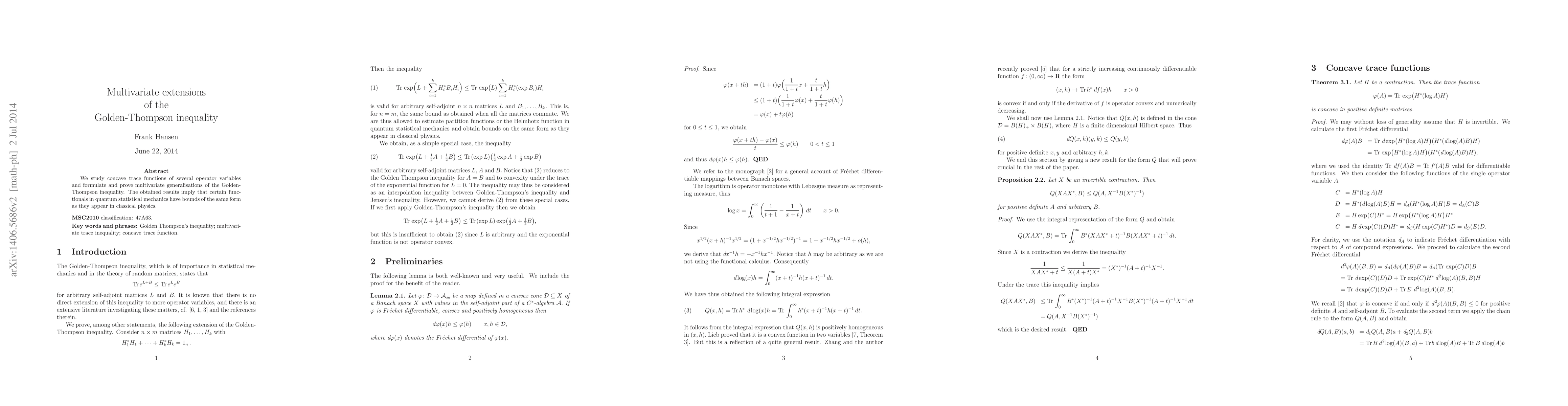This paper formulates and proves multivariate generalizations of the Golden-Thompson inequality for concave trace functions of multiple operator variables. The results establish bounds for functionals in quantum statistical mechanics that mirror those found in classical physics.