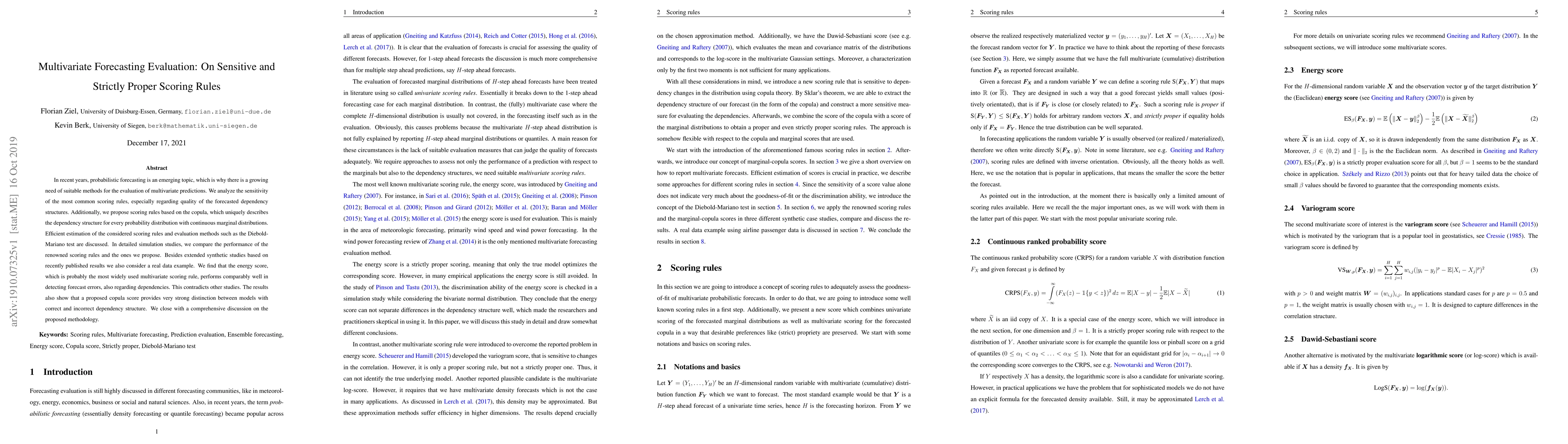 This study evaluates multivariate forecasting methods using scoring rules that assess forecast accuracy and dependency structure. It finds that the energy score is a strong performer in detecting errors, while a new copula-based scoring rule provides excellent distinction between correct and incorrect dependency structures.