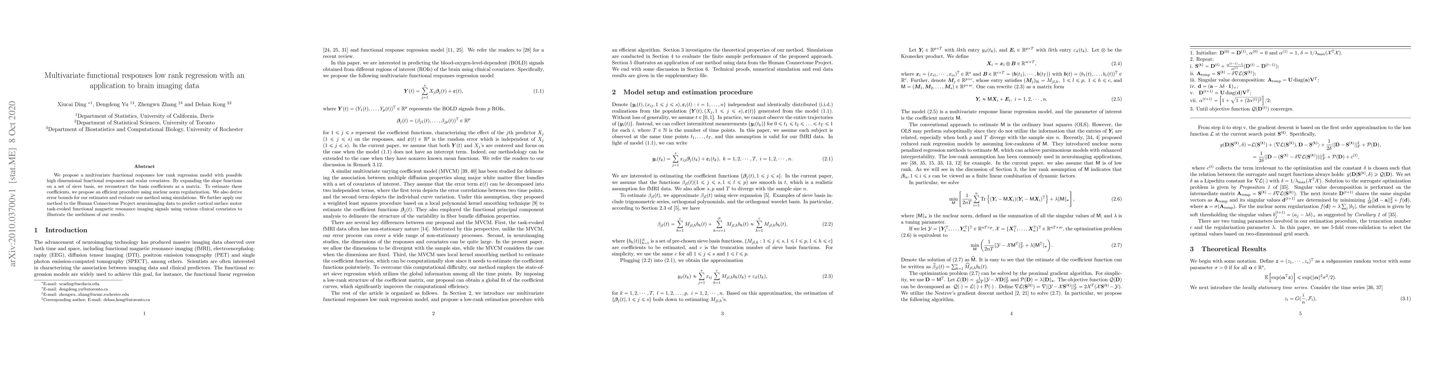 This paper introduces a low rank regression model for multivariate functional responses, employing a nuclear norm regularization technique to estimate basis coefficients. The method is validated through simulations and applied to Human Connectome Project data to predict motor task-evoked fMRI signals using clinical covariates.