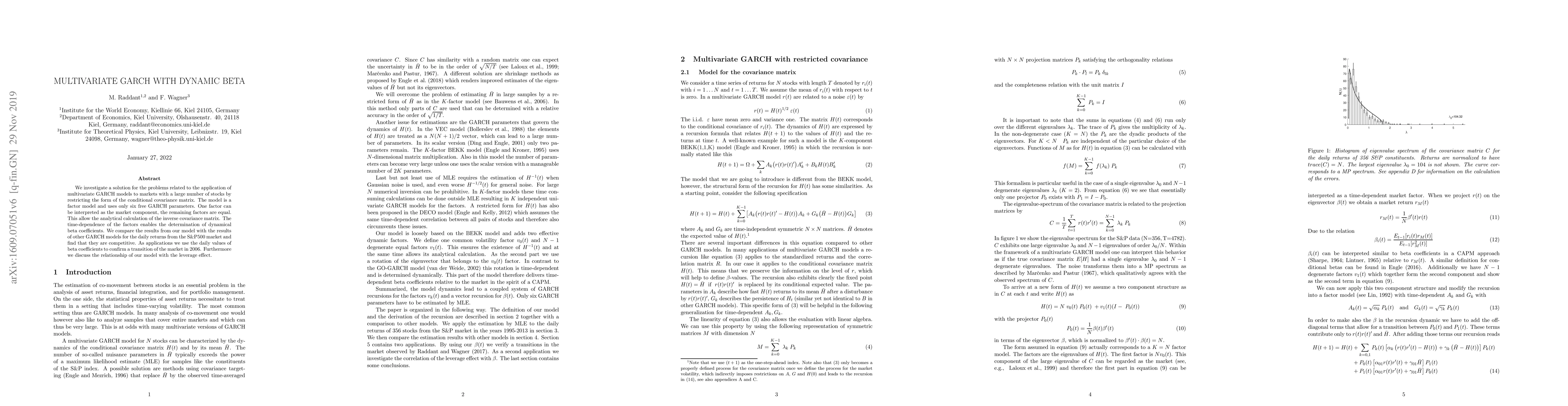 We investigate a solution for the problems related to the application of multivariate GARCH models to markets with a large number of stocks by restricting the form of the conditional covariance matrix. The model is a factor model and uses only six free GARCH parameters. One factor can be interpreted as the market component, the remaining factors are equal. This allow the analytical calculation of the inverse covariance matrix. The time-dependence of the factors enables the determination of dynamical beta coefficients. We compare the results from our model with the results of other GARCH models for the daily returns from the S\&P500 market and find that they are competitive. As applications we use the daily values of beta coefficients to confirm a transition of the market in 2006. Furthermore we discuss the relationship of our model with the leverage effect.