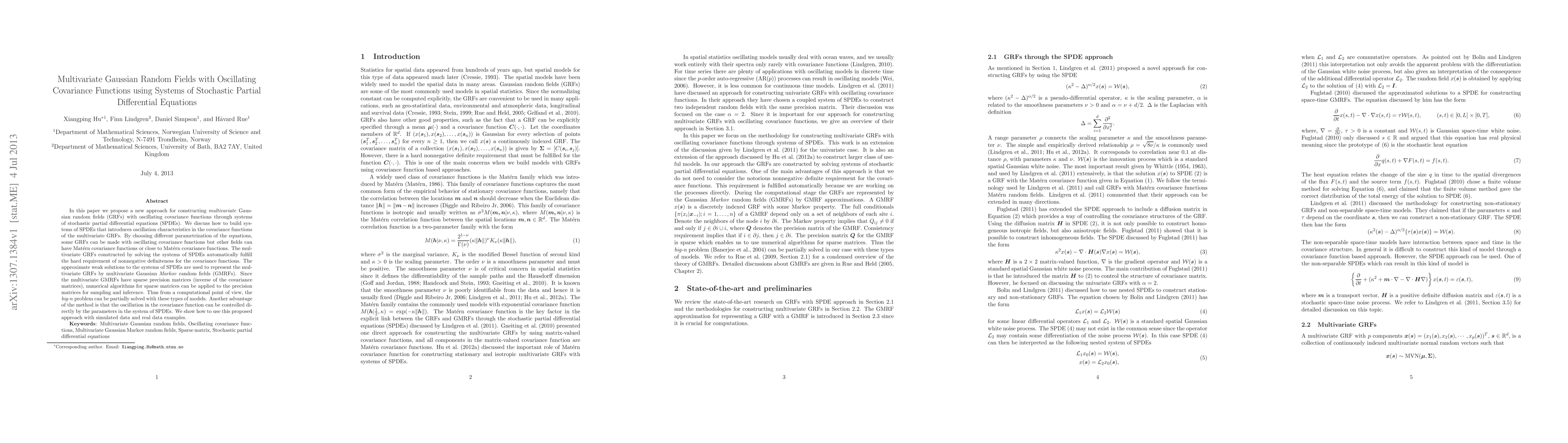 This paper introduces a novel method for constructing multivariate Gaussian random fields with oscillating covariance functions via stochastic partial differential equations. The approach allows for flexible covariance structures, including oscillating, Matérn, or near-Matérn forms, and leverages approximate weak solutions to efficiently handle large-scale computations.