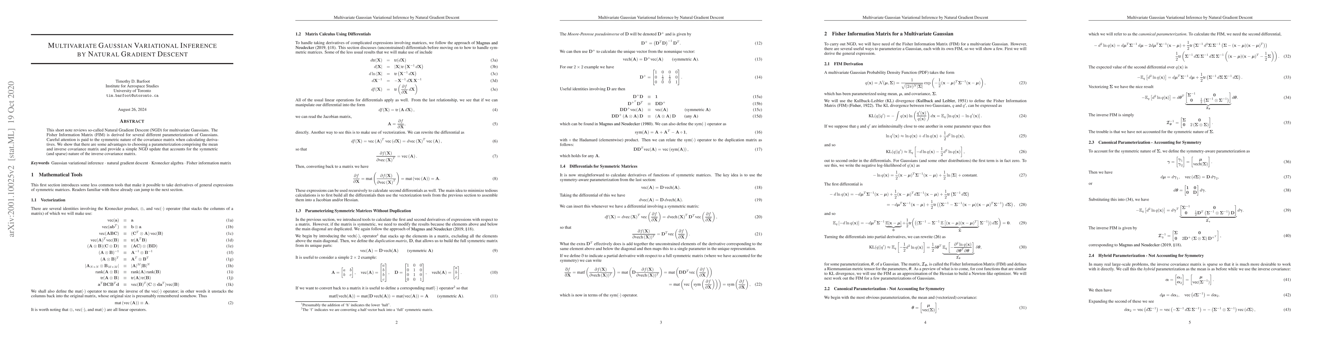 The paper reviews Natural Gradient Descent (NGD) for multivariate Gaussians, deriving the Fisher Information Matrix (FIM) for various parameterizations, with careful consideration for the symmetric nature of the covariance matrix when calculating derivatives.