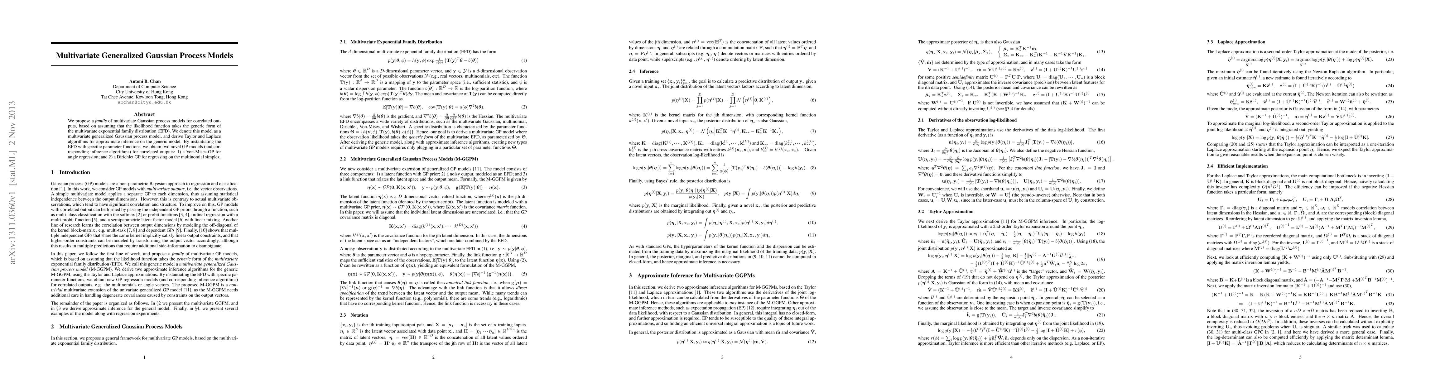 This paper introduces a multivariate generalized Gaussian process model based on the multivariate exponential family distribution, proposing two novel GP models: a Von-Mises GP for angle regression and a Dirichlet GP for multinomial simplex regression, along with corresponding inference algorithms.