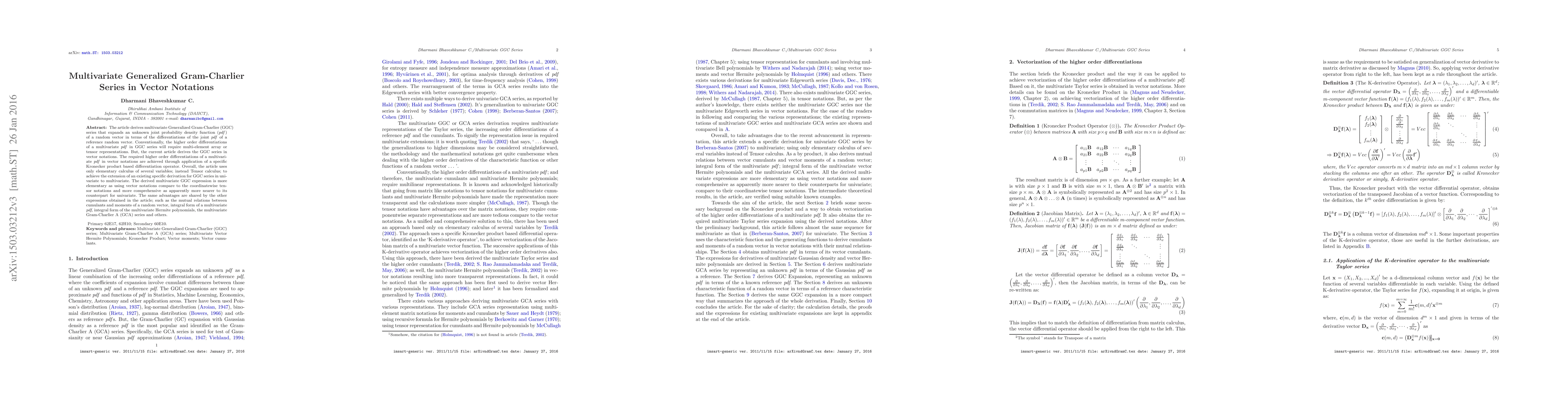 The article derives multivariate Generalized Gram-Charlier (GGC) series that expands an unknown joint probability density function (\textit{pdf}) of a random vector in terms of the differentiations of the joint \textit{pdf} of a reference random vector. Conventionally, the higher order differentiations of a multivariate \textit{pdf} in GGC series will require multi-element array or tensor representations. But, the current article derives the GGC series in vector notations. The required higher order differentiations of a multivariate \textit{pdf} in vector notations are achieved through application of a specific Kronecker product based differentiation operator. Overall, the article uses only elementary calculus of several variables; instead Tensor calculus; to achieve the extension of an existing specific derivation for GGC series in univariate to multivariate. The derived multivariate GGC expression is more elementary as using vector notations compare to the coordinatewise tensor notations and more comprehensive as apparently more nearer to its counterpart for univariate. The same advantages are shared by the other expressions obtained in the article; such as the mutual relations between cumulants and moments of a random vector, integral form of a multivariate \textit{pdf}, integral form of the multivariate Hermite polynomials, the multivariate Gram-Charlier A (GCA) series and others.