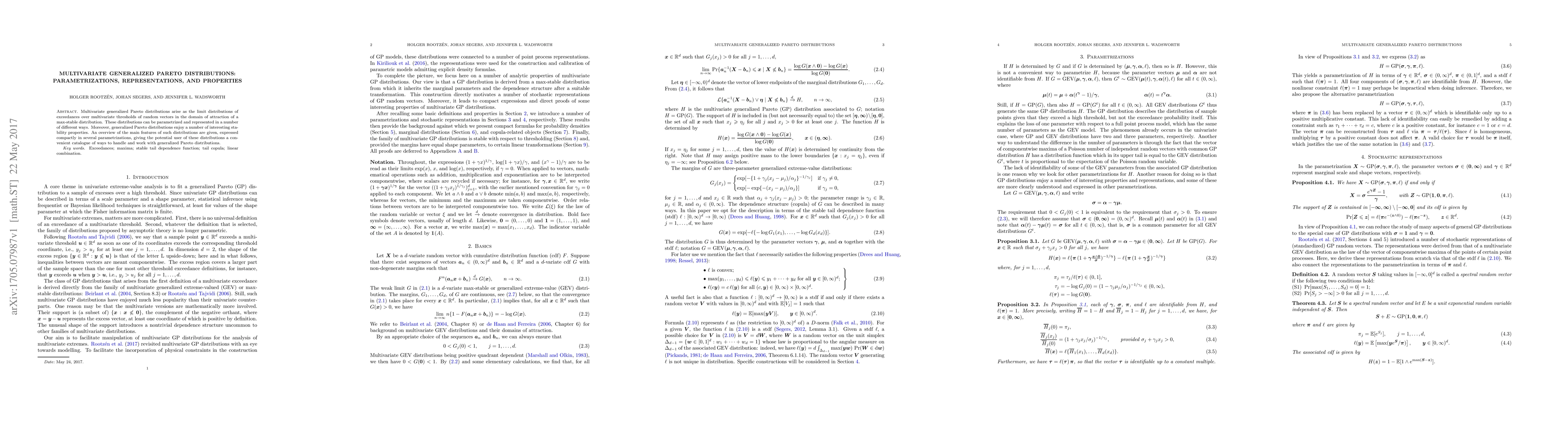 Multivariate generalized Pareto distributions arise as the limit distributions of exceedances over multivariate thresholds of random vectors in the domain of attraction of a max-stable distribution. These distributions can be parametrized and represented in a number of different ways. Moreover, generalized Pareto distributions enjoy a number of interesting stability properties. An overview of the main features of such distributions are given, expressed compactly in several parametrizations, giving the potential user of these distributions a convenient catalogue of ways to handle and work with generalized Pareto distributions.