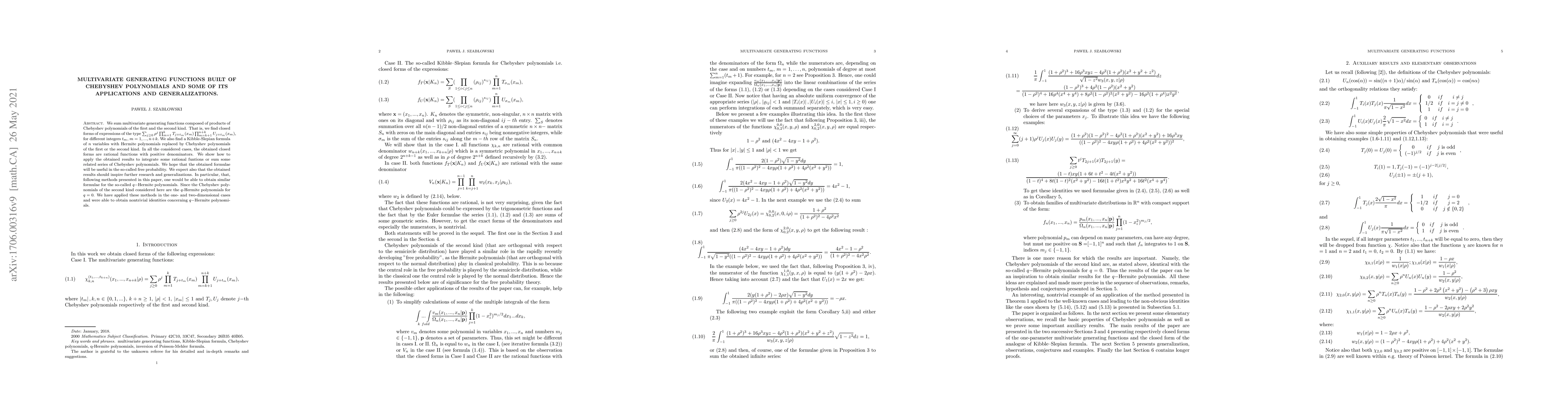 This paper derives multivariate generating functions based on products of Chebyshev polynomials and provides closed forms for specific summations. It also presents a Kibble-Slepian formula with Chebyshev polynomials and applies the results to integrate rational functions and sum related series. The findings are expected to be useful in free probability and inspire further generalizations, including $q$-Hermite polynomials.