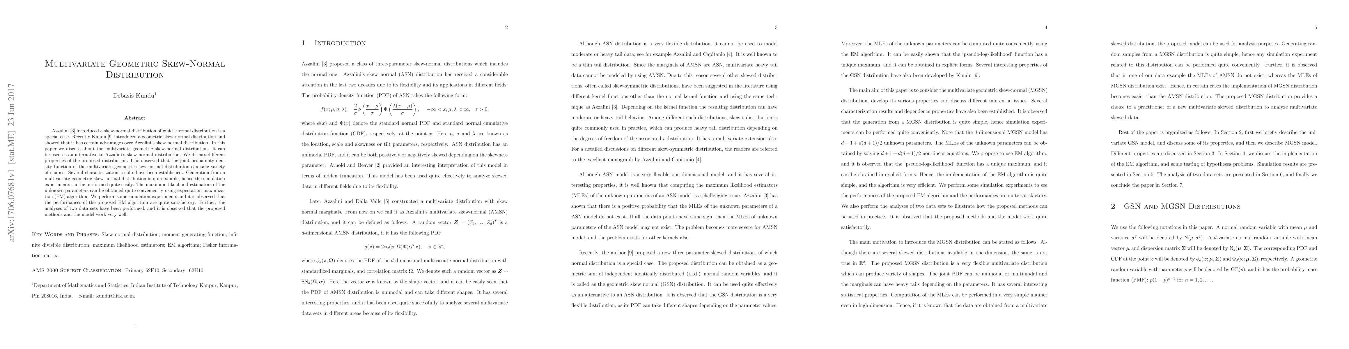 This paper introduces a multivariate geometric skew-normal distribution as an alternative to Azzalini's skew-normal distribution, highlighting its flexible shape and easy simulation. The proposed EM algorithm for parameter estimation performs satisfactorily in simulations, and the model effectively analyzes real data sets.