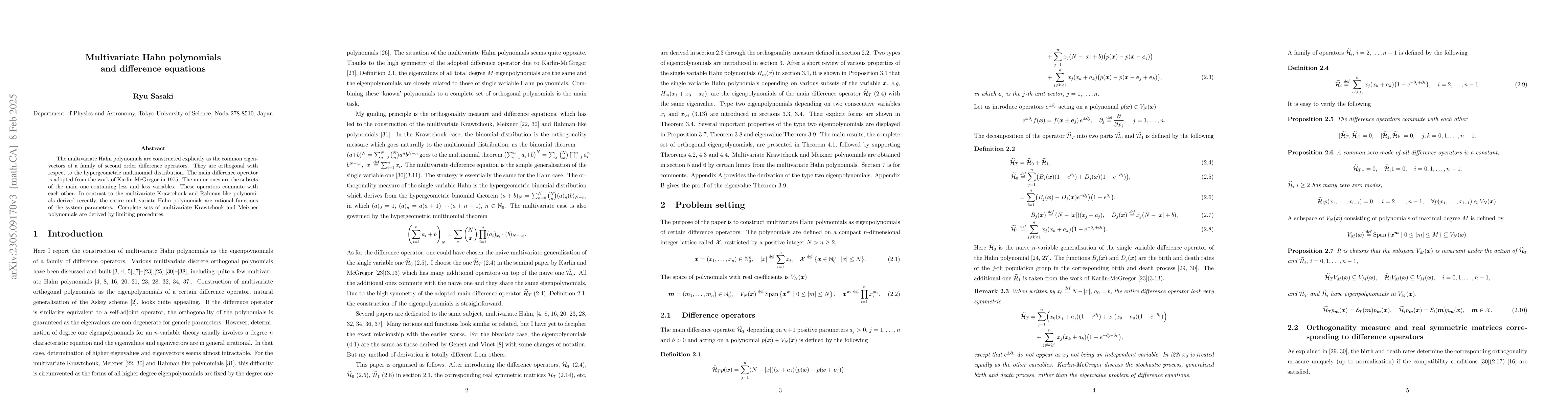 Following the success of the explicit construction of the multivariate Krawtchouk polynomials as the birth and death polynomials, a formulation of multivariate Hahn polynomials is proposed in the same style. The difference equations specified by the birth/death rates have polynomial eigenvectors which form the complete set of orthogonal multivariate Hahn polynomials. Although the degree one eigenpolynomials are easy to derive, the complete hypergeometric expressions are yet to be determined. In a certain limit, these Hahn polynomials reduce to the multivariate Krawtchouk polynomials. The known limiting procedures to the Meixner and Charlier polynomials produce trivial results of the direct products of the single variable polynomials.