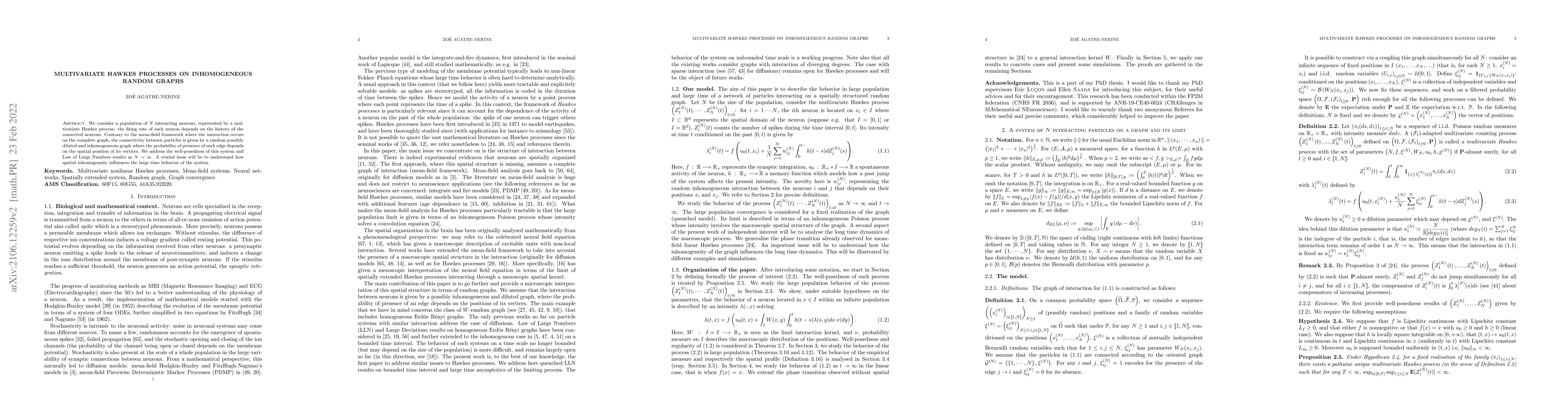 This research analyzes how large networks of interacting neurons, modeled by Hawkes processes, behave when their connections are randomly distributed and inhomogeneous in space. It explores the existence, uniqueness, and long-term behavior of these systems as the number of neurons grows.