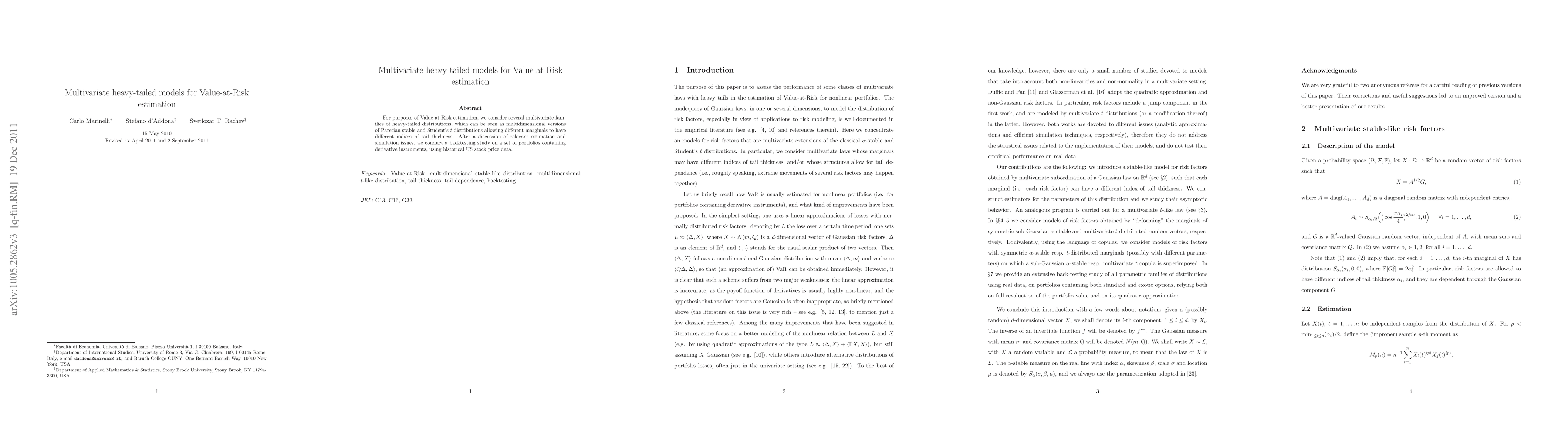 For purposes of Value-at-Risk estimation, we consider several multivariate families of heavy-tailed distributions, which can be seen as multidimensional versions of Paretian stable and Student's t distributions allowing different marginals to have different tail thickness. After a discussion of relevant estimation and simulation issues, we conduct a backtesting study on a set of portfolios containing derivative instruments, using historical US stock price data.