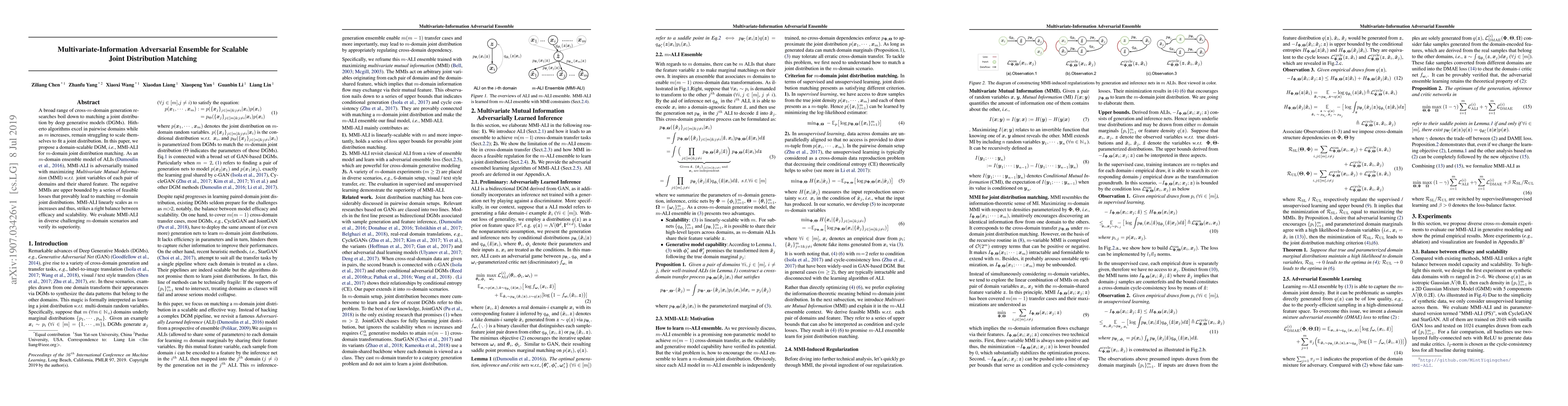A broad range of cross-$m$-domain generation researches boil down to matching a joint distribution by deep generative models (DGMs). Hitherto algorithms excel in pairwise domains while as $m$ increases, remain struggling to scale themselves to fit a joint distribution. In this paper, we propose a domain-scalable DGM, i.e., MMI-ALI for $m$-domain joint distribution matching. As an $m$-domain ensemble model of ALIs \cite{dumoulin2016adversarially}, MMI-ALI is adversarially trained with maximizing Multivariate Mutual Information (MMI) w.r.t. joint variables of each pair of domains and their shared feature. The negative MMIs are upper bounded by a series of feasible losses that provably lead to matching $m$-domain joint distributions. MMI-ALI linearly scales as $m$ increases and thus, strikes a right balance between efficacy and scalability. We evaluate MMI-ALI in diverse challenging $m$-domain scenarios and verify its superiority.