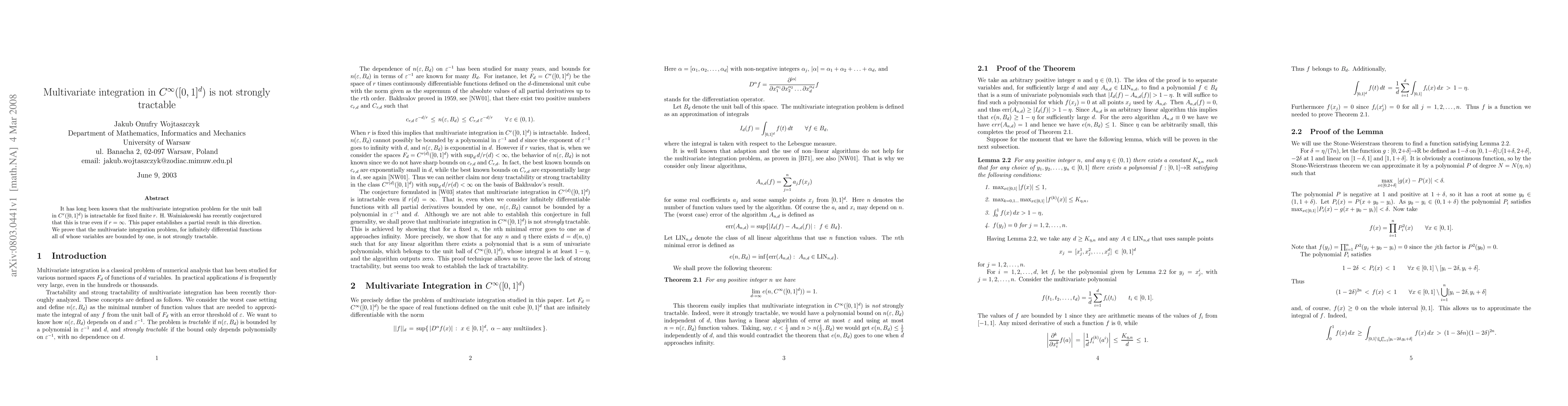 It has long been known that the multivariate integration problem for the unit ball in $C^r([0,1]^d)$ is intractable for fixed finite $r$. H. Wo\'zniakowski has recently conjectured that this is true even if $r=\infty$. This paper establishes a partial result in this direction. We prove that the multivariate integration problem, for infinitely differential functions all of whose variables are bounded by one, is not strongly tractable.