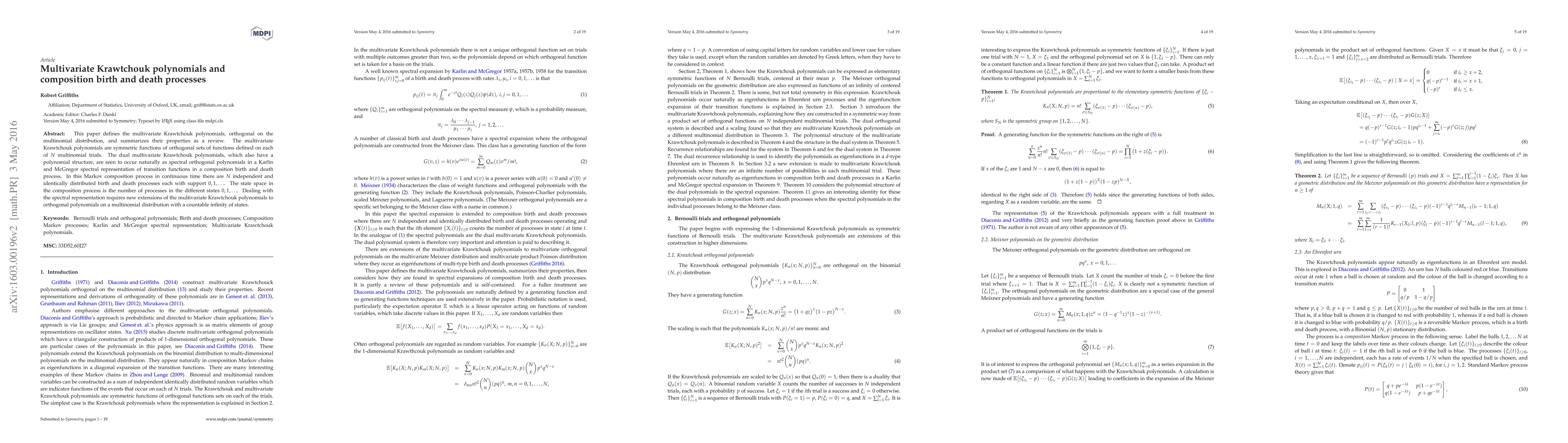 This paper reviews multivariate Krawtchouk polynomials, which are orthogonal on multinomial distributions and used in symmetric function sets for N multinomial trials. It also discusses how dual multivariate Krawtchouk polynomials arise in the spectral representation of transition functions in a continuous-time Markov composition birth and death process.