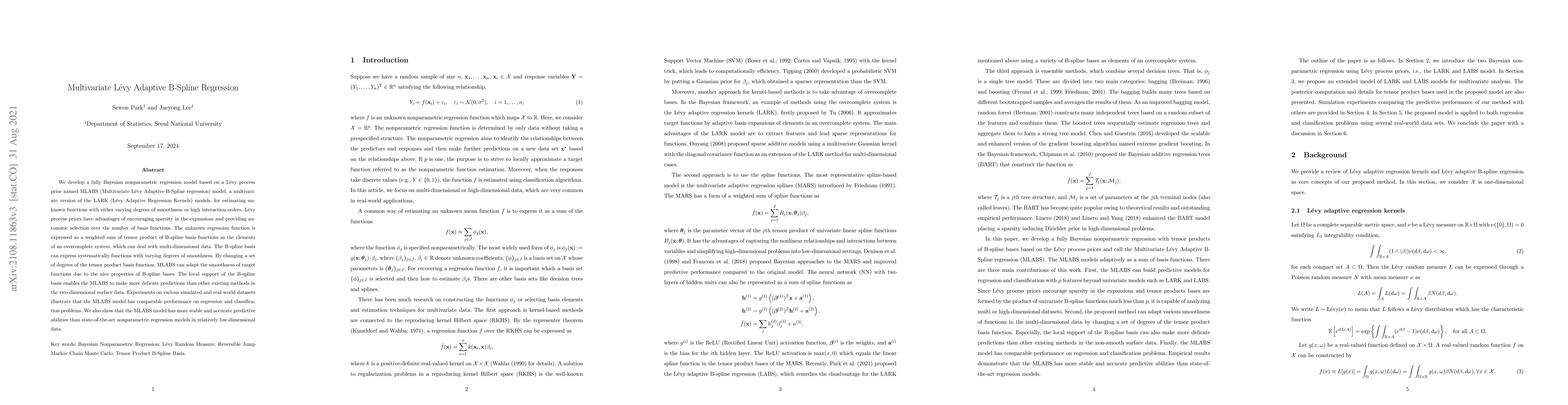 The MLABS model is a Bayesian nonparametric regression framework based on a L\'evy process prior, utilizing B-spline basis functions for estimating functions with varying smoothness. It demonstrates superior performance and stability compared to other methods, especially in low-dimensional data.