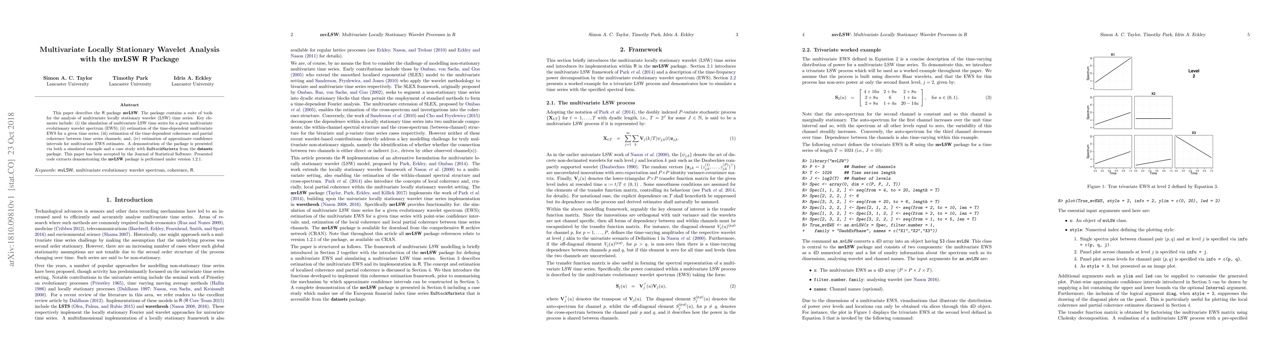 This paper introduces the R package mvLSW for analyzing multivariate locally stationary wavelet time series, featuring simulation, estimation, and coherence analysis tools. It includes a demonstration using both simulated data and real-world financial datasets.