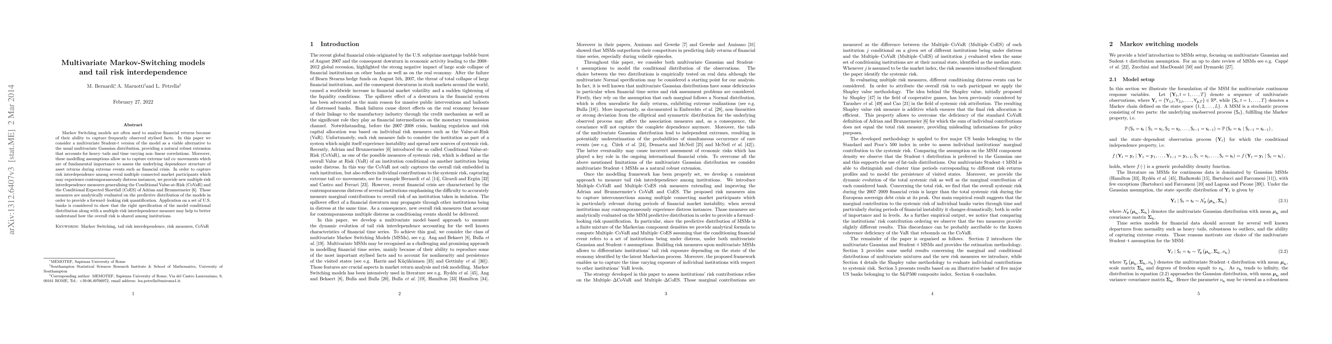 Markov switching models are often used to analyze financial returns because of their ability to capture frequently observed stylized facts. In this paper we consider a multivariate Student-t version of the model as a viable alternative to the usual multivariate Gaussian distribution, providing a natural robust extension that accounts for heavy-tails and time varying non-linear correlations. Moreover, these modelling assumptions allow us to capture extreme tail co-movements which are of fundamental importance to assess the underlying dependence structure of asset returns during extreme events such as financial crisis. For the considered model we provide new risk interdependence measures which generalize the existing ones, like the Conditional Value-at-Risk (CoVaR). The proposed measures aim to capture interconnections among multiple connecting market participants which is particularly relevant during period of crisis when several institutions may contemporaneously experience distress instances. Those measures are analytically evaluated on the predictive distribution of the modes in order to provide a forward-looking risk quantification. Application on a set of U.S. banks is considered to show that the right specification of the model conditional distribution along with a multiple risk interdependence measure may help to better understand how the overall risk is shared among institutions.