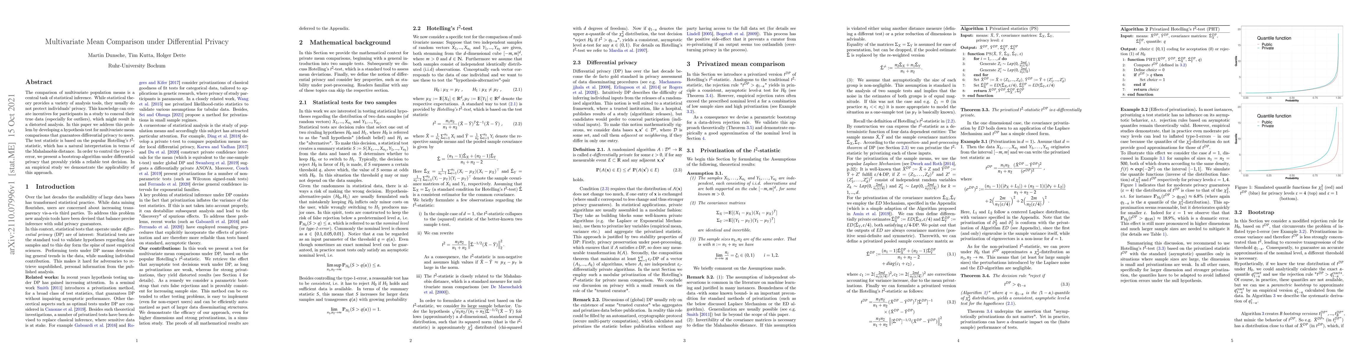 The comparison of multivariate population means is a central task of statistical inference. While statistical theory provides a variety of analysis tools, they usually do not protect individuals' privacy. This knowledge can create incentives for participants in a study to conceal their true data (especially for outliers), which might result in a distorted analysis. In this paper we address this problem by developing a hypothesis test for multivariate mean comparisons that guarantees differential privacy to users. The test statistic is based on the popular Hotelling's $t^2$-statistic, which has a natural interpretation in terms of the Mahalanobis distance. In order to control the type-1-error, we present a bootstrap algorithm under differential privacy that provably yields a reliable test decision. In an empirical study we demonstrate the applicability of this approach.