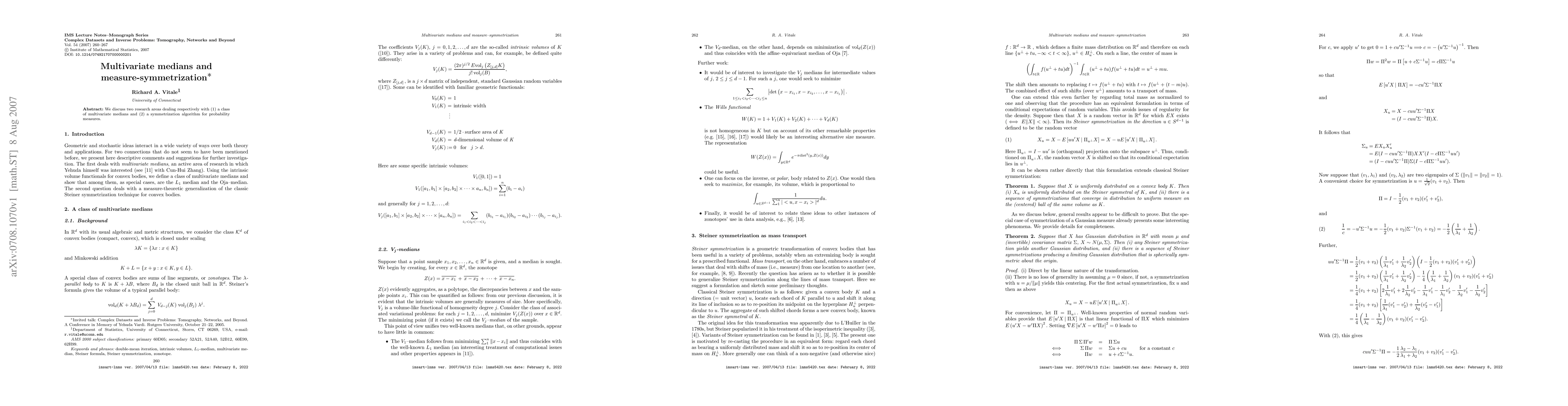 Summary: This paper explores a class of multivariate medians and introduces a measure-symmetrization algorithm for probability measures, aiming to address symmetry issues in statistical analysis.