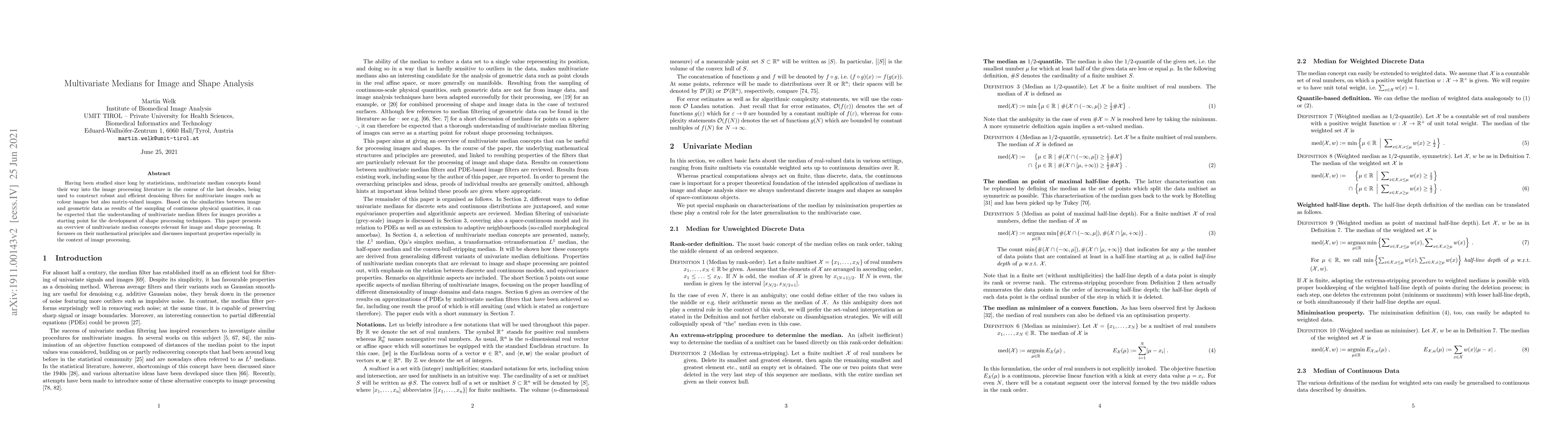 Having been studied since long by statisticians, multivariate median concepts found their way into the image processing literature in the course of the last decades, being used to construct robust and efficient denoising filters for multivariate images such as colour images but also matrix-valued images. Based on the similarities between image and geometric data as results of the sampling of continuous physical quantities, it can be expected that the understanding of multivariate median filters for images provides a starting point for the development of shape processing techniques. This paper presents an overview of multivariate median concepts relevant for image and shape processing. It focusses on their mathematical principles and discusses important properties especially in the context of image processing.