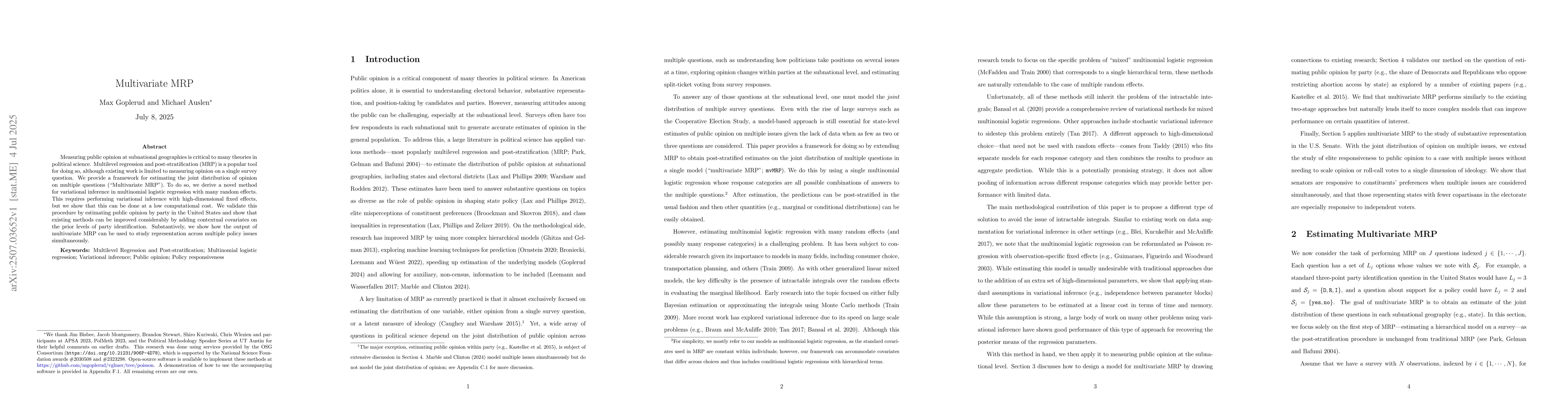 Measuring public opinion at subnational geographies is critical to many theories in political science. Multilevel regression and post-stratification (MRP) is a popular tool for doing so, although existing work is limited to measuring opinion on a single survey question. We provide a framework for estimating the joint distribution of opinion on multiple questions ("Multivariate MRP"). To do so, we derive a novel method for variational inference in multinomial logistic regression with many random effects. This requires performing variational inference with high-dimensional fixed effects, but we show that this can be done at a low computational cost. We validate this procedure by estimating public opinion by party in the United States and show that existing methods can be improved considerably by adding contextual covariates on the prior levels of party identification. Substantively, we show how the output of multivariate MRP can be used to study representation across multiple policy issues simultaneously.
