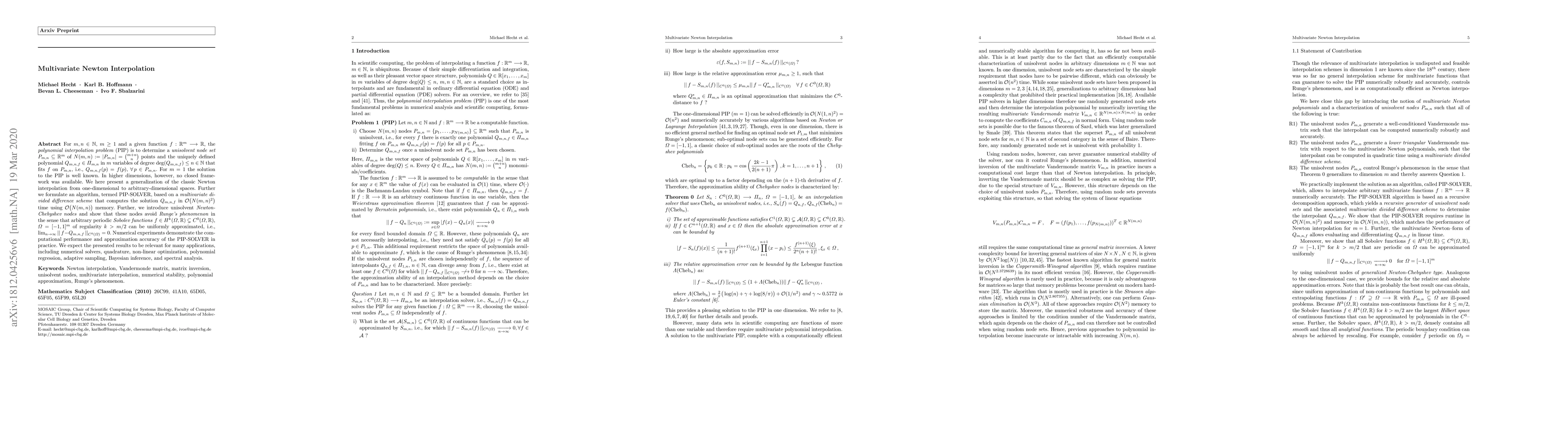 This paper generalizes Newton interpolation to multivariate settings, presenting a PIP-SOLVER algorithm for polynomial interpolation in $m$ dimensions. The algorithm efficiently computes the interpolating polynomial in $\mathcal{O}\big(N(m,n)^2\big)$ time and introduces unisolvent Newton-Chebyshev nodes that avoid Runge's phenomenon, enabling accurate approximation of periodic Sobolev functions.
