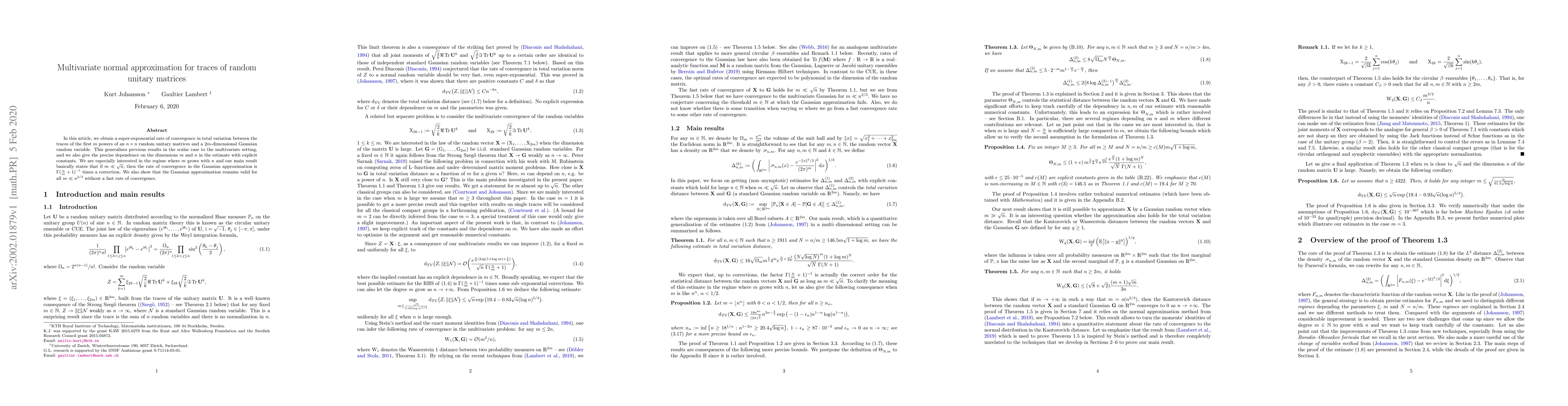 In this article, we obtain a super-exponential rate of convergence in total variation between the traces of the first $m$ powers of an $n\times n$ random unitary matrices and a $2m$-dimensional Gaussian random variable. This generalizes previous results in the scalar case to the multivariate setting, and we also give the precise dependence on the dimensions $m$ and $n$ in the estimate with explicit constants. We are especially interested in the regime where $m$ grows with $n$ and our main result basically states that if $m\ll \sqrt{n}$, then the rate of convergence in the Gaussian approximation is $\Gamma(\frac nm+1)^{-1}$ times a correction. We also show that the Gaussian approximation remains valid for all $m\ll n^{2/3}$ without a fast rate of convergence.